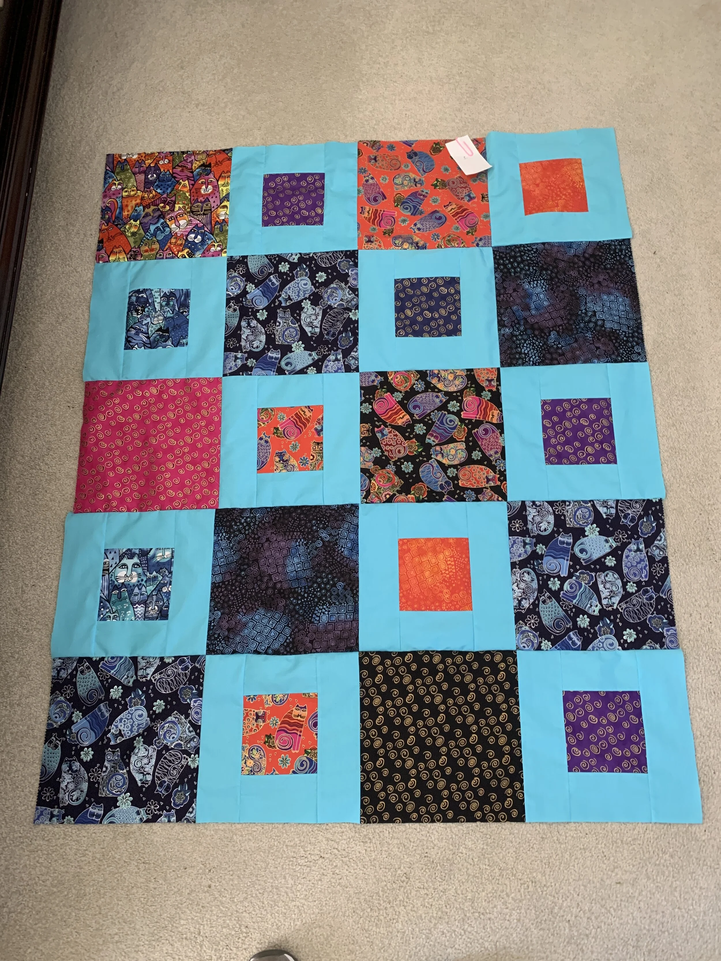 The quilt top is complete ! And I’ve made significant strides in my sewing and piecing because most of the corners match 😁 I have a little bobble here and there, but I think the quilting process will mask most of those. I’m real pleased with the colors in this quilt. My sister saw the fabric picture and asked how the baby would sleep since the fabric was soooo “loud”. I laughed and said I considered the fabric bold and vibrant and someone with the same taste would like it too. I think the turquoise helped cool it down, though. And wait’ll you see the backing I’ve chosen 😉