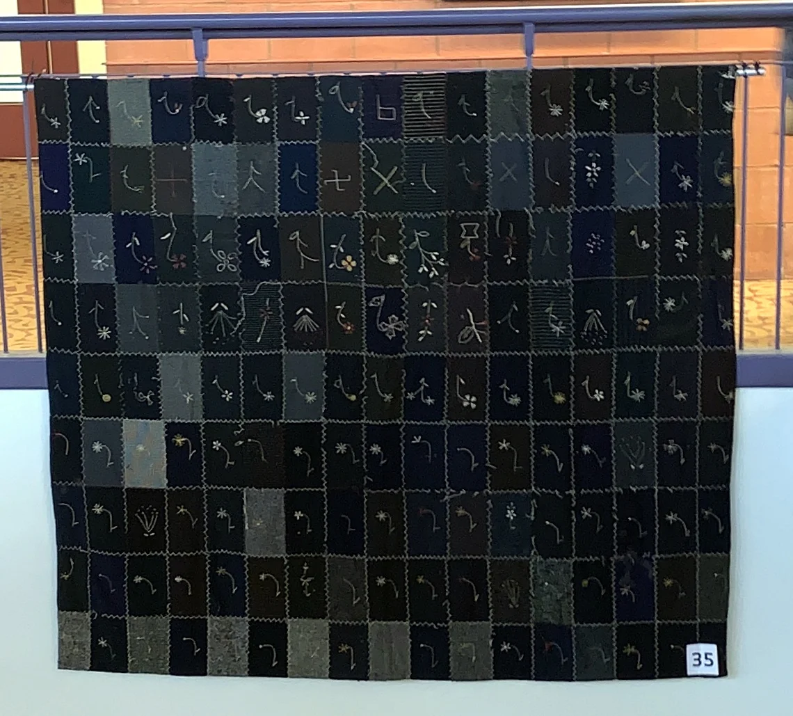 The pictured quilt is an antique from about 1910. The woman who created it was a seamstress and had wool samples for men’s suits. The man would choose the fabric, she would order the appropriate quantity and then used some of the fabric to create the quilt. She embroidered a simple flower on each swatch.
