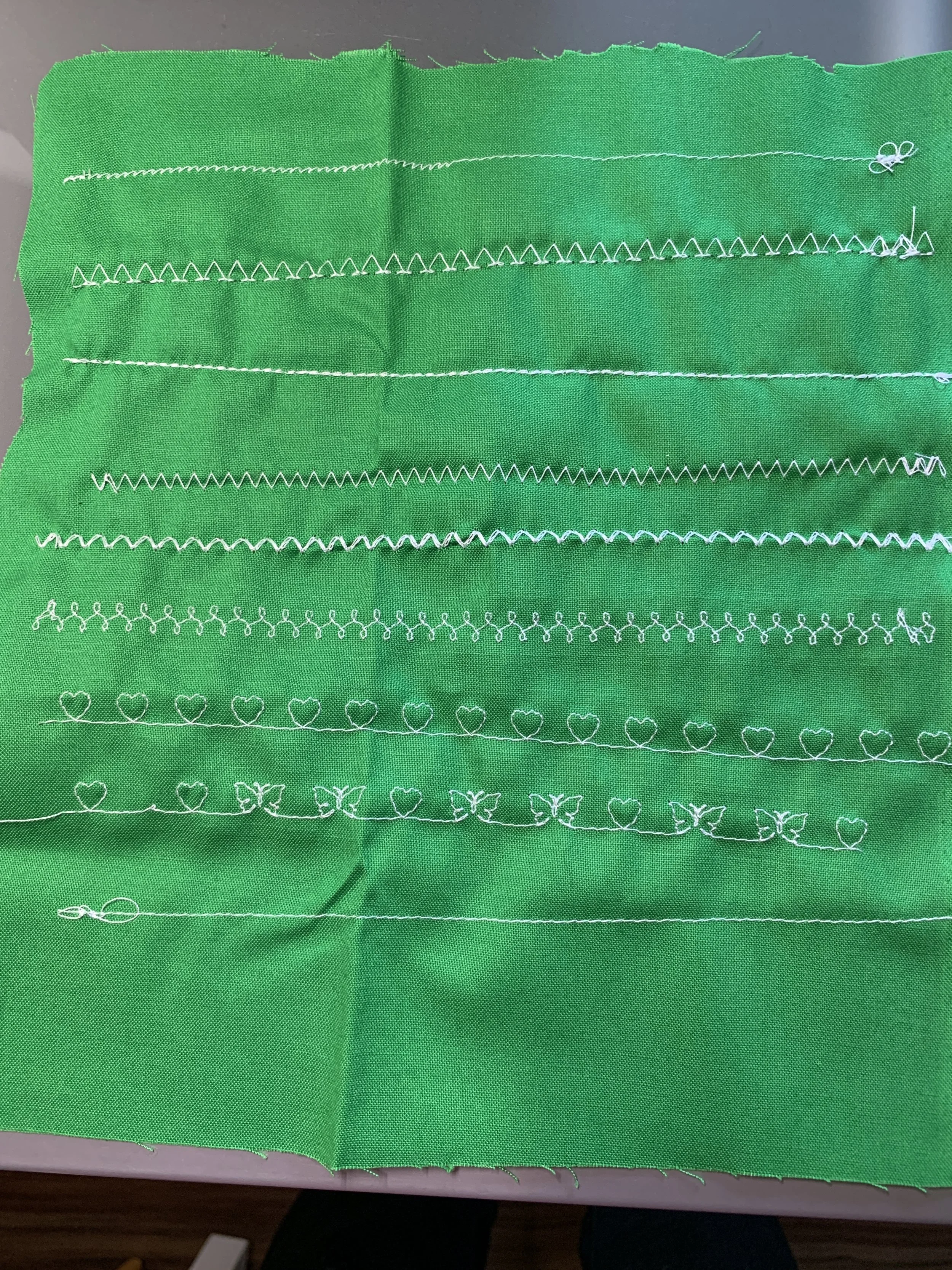 Quilting has been calling to me for more than two years and I’ve decided to heed the call. After much research I purchased a Singer Quantum Stylist 9960. It doesn’t do embroidery stitches but it does do fancy stitches (600 or so (!) ). The first picture is the machine and the second is a randomly chosen group of stitches.