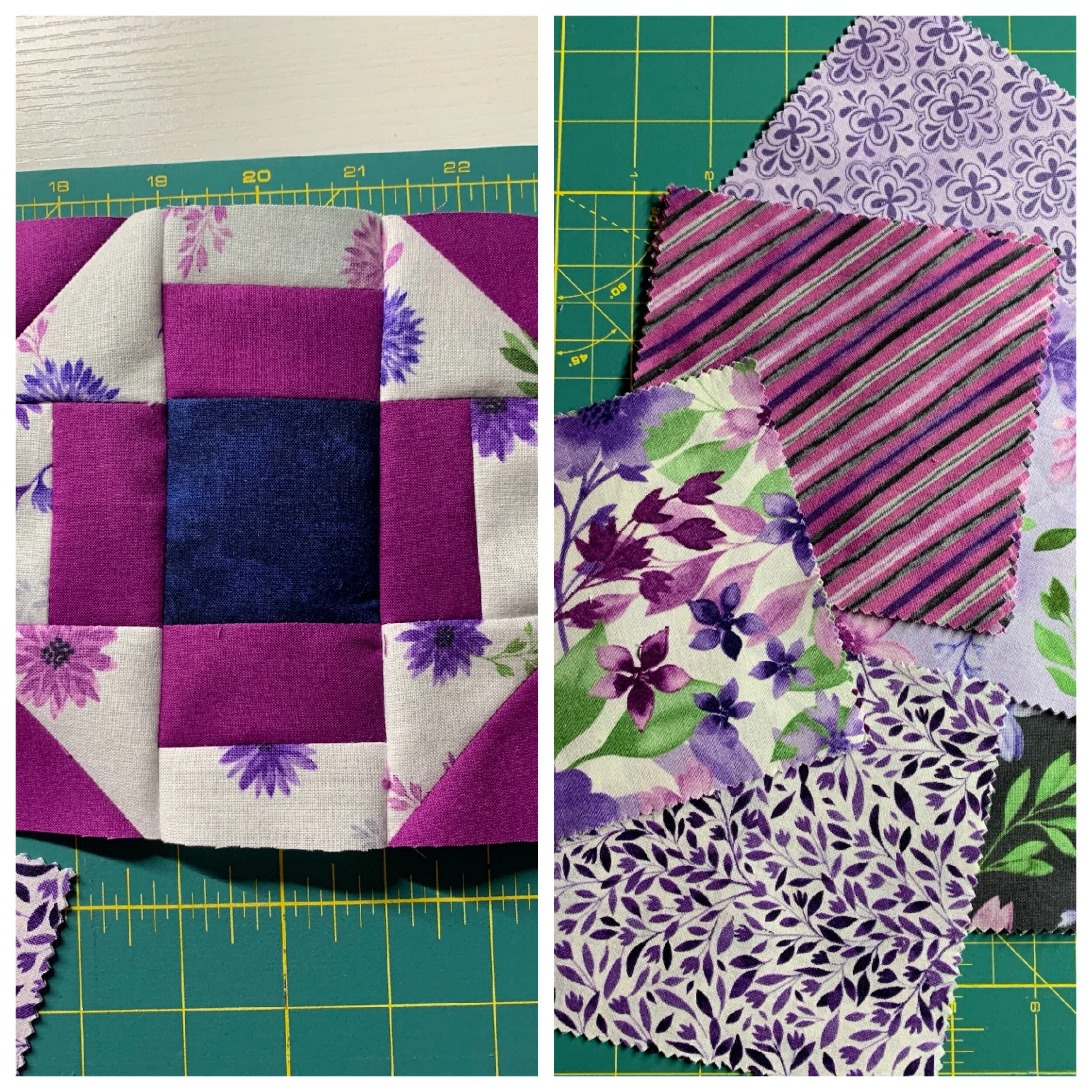 On the left is the sample block that I created to see if the colors were right - and they were ! On the right is a selection of fabric I’ll use to create the blocks.