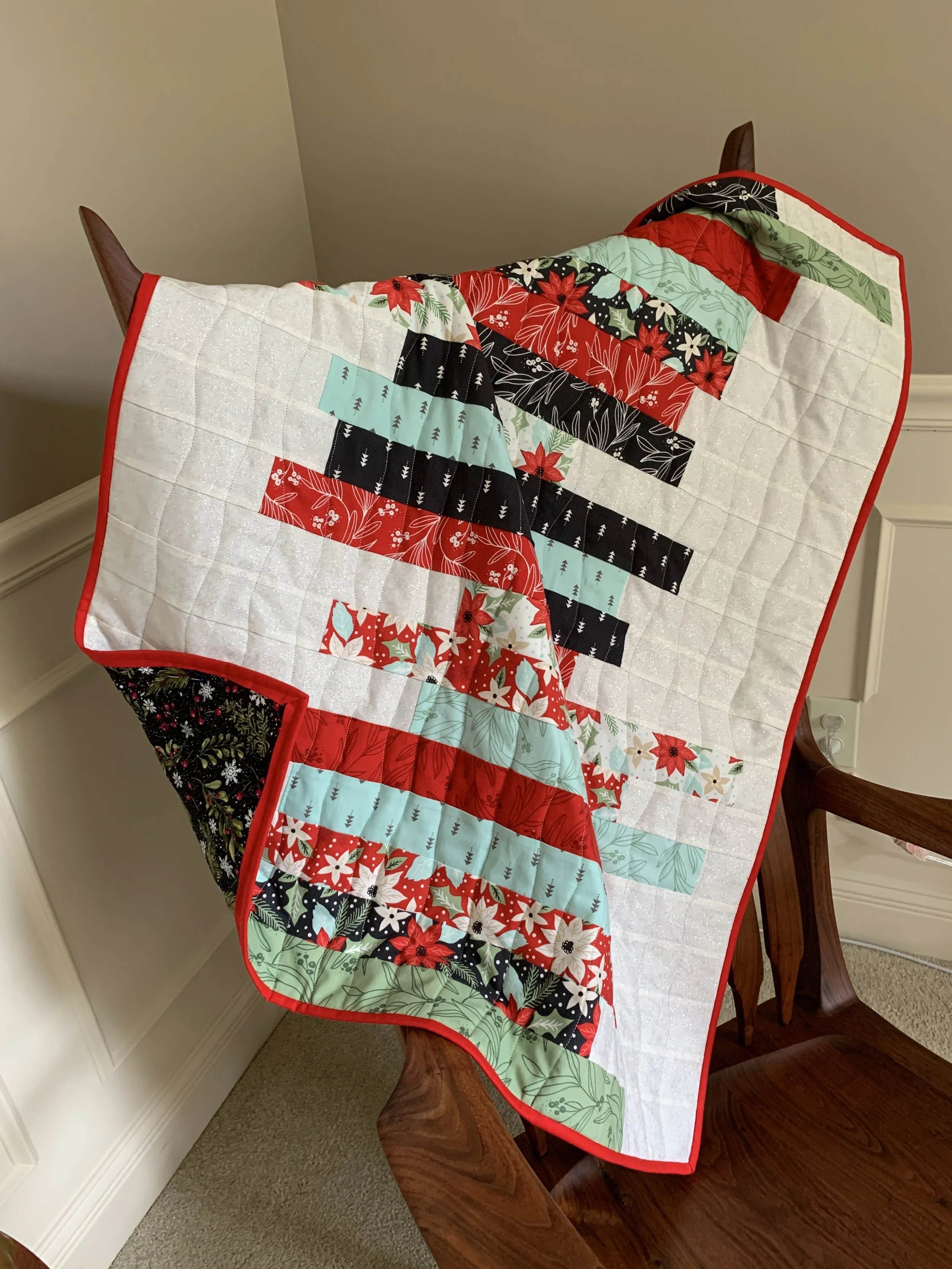 The Christmas quilt is complete and I’m pleased with the outcome. I bought a binding tool that makes joining the ends of the binding fabric dead simple !! Happy dance. . .