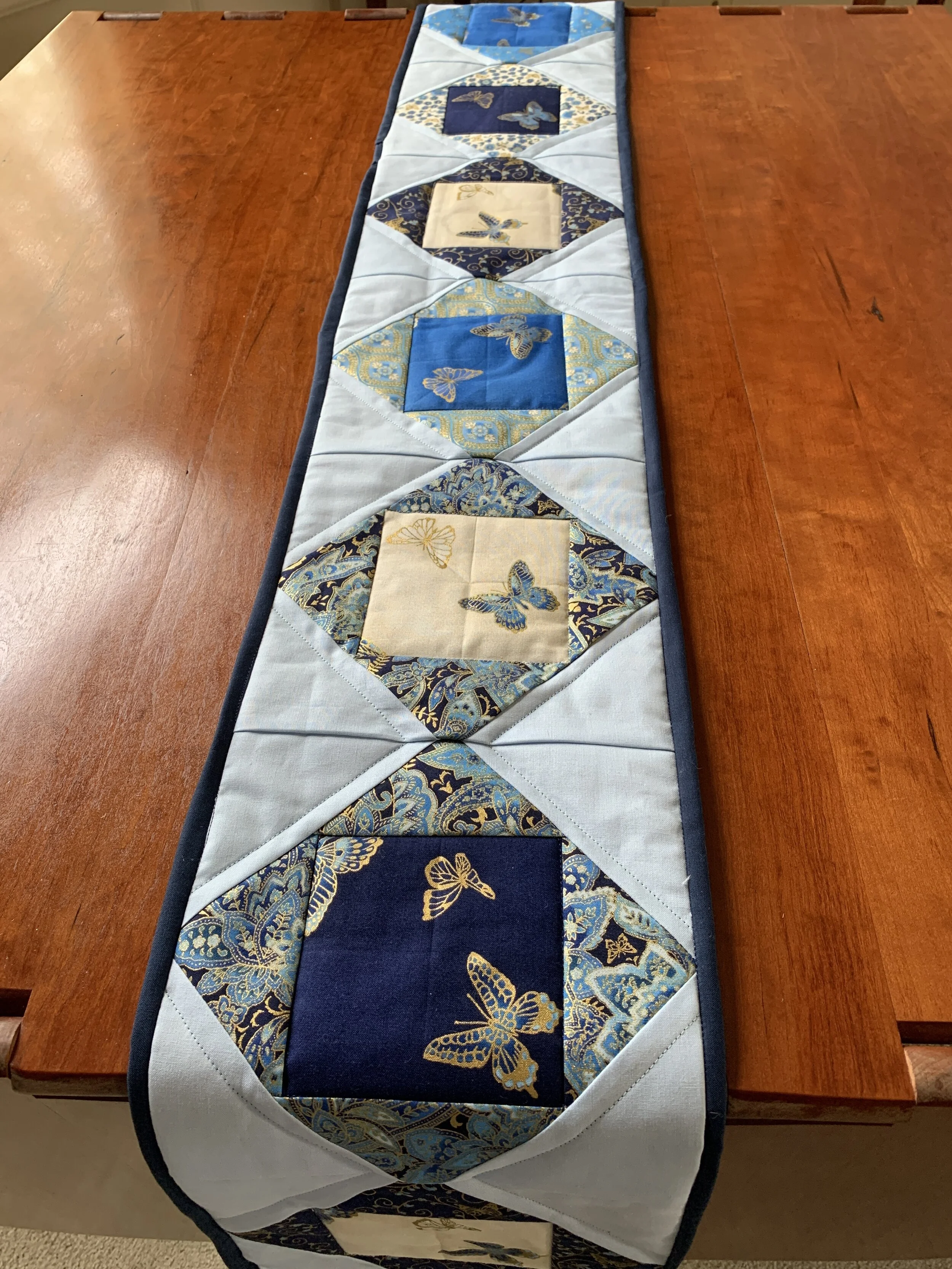 I also created a table topper using the Economy block (also called square-in-square). I fell in love with the butterfly fabric and thought the block would show it off nicely. It will be our spring/summer topper.