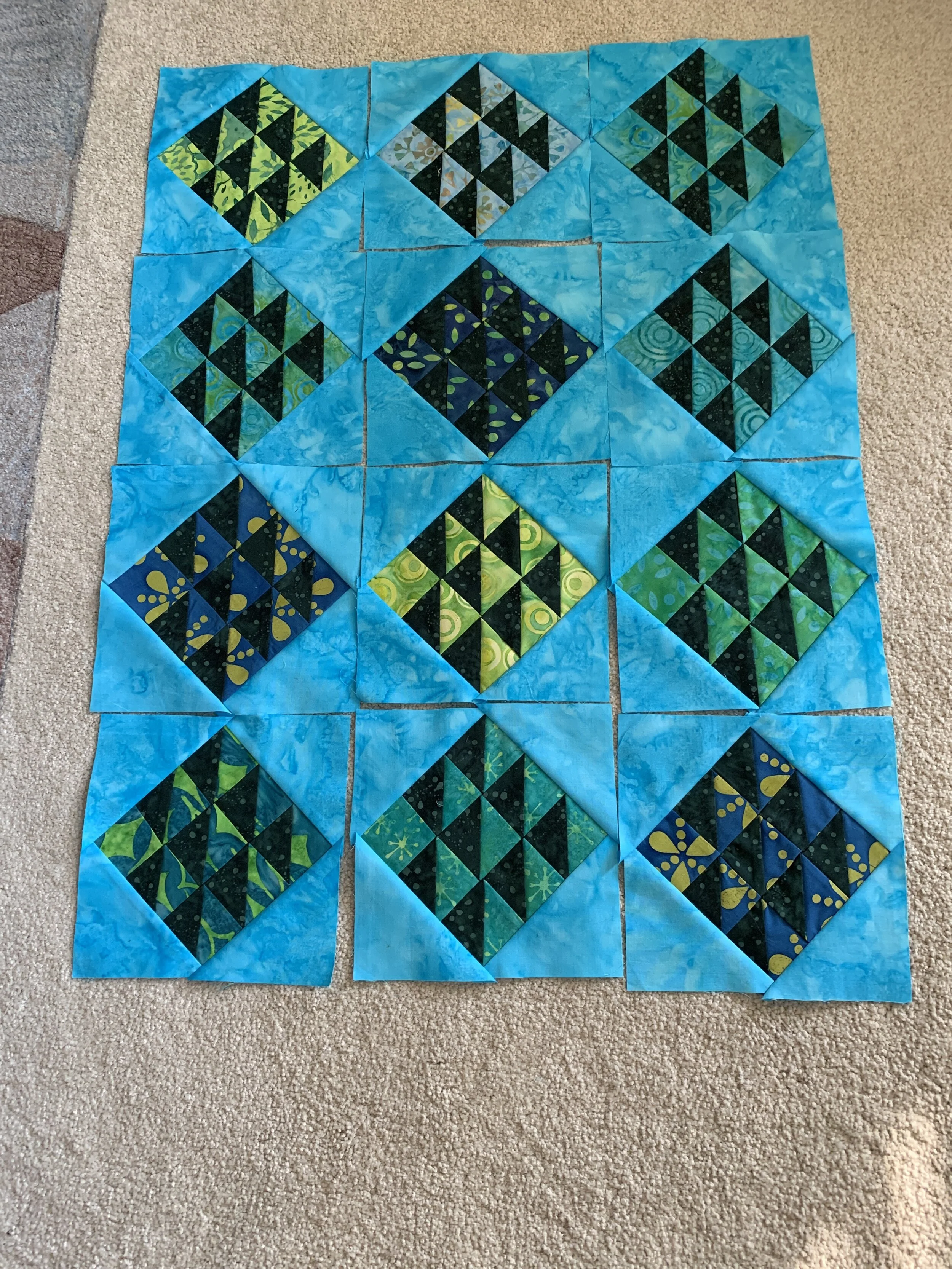 The fish quilt is coming along as you can see from the layout above. I need to square up the blocks but I like the layout and Mike approves (heโs my design guru ๐ ) . Once Iโm ready to quilt (which will be soon) I found a variegated blue and green thread and I plan to use wavy quilt lines which might simulate ocean movement.