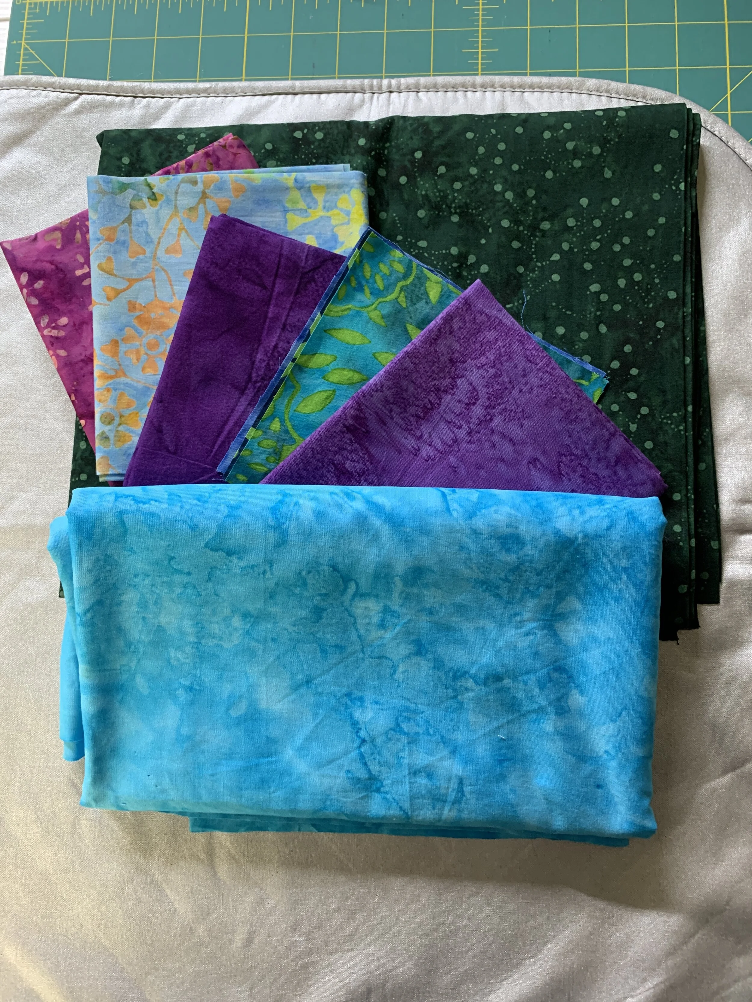 I’ve begun working on a quilt titled “A Kettle of Fish” using batik fabric. Here’s a picture of some of the fabric I’m using