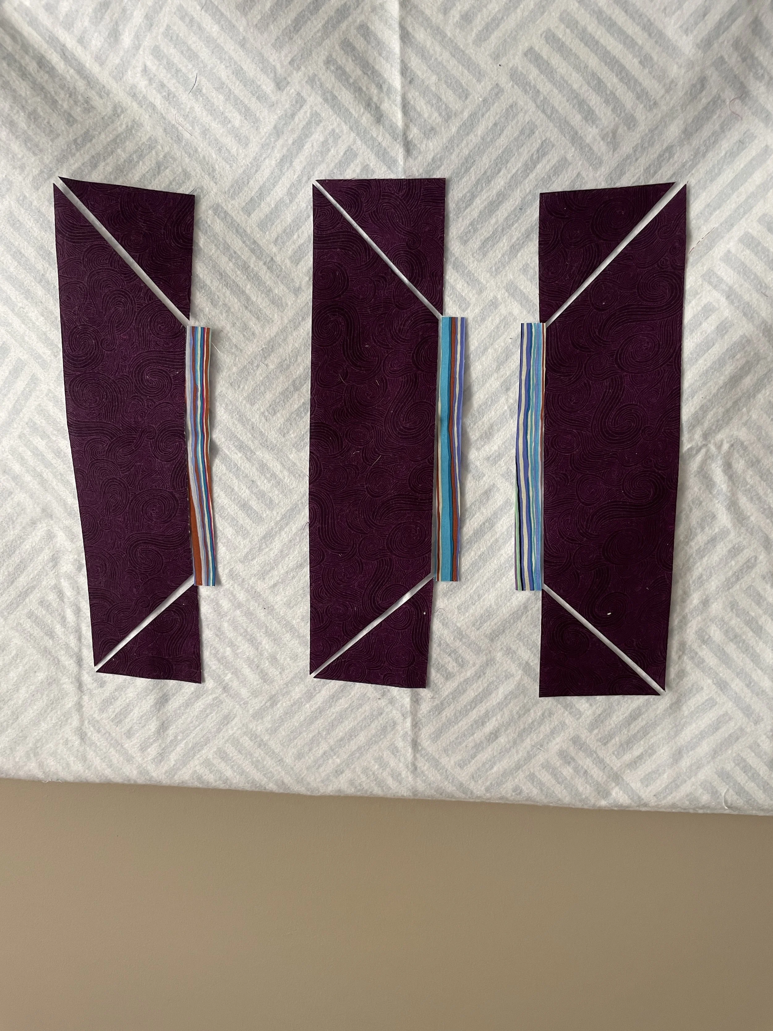 Over the past couple of days, I’ve studied the pattern and, as I do quite often, I pulled some scrap fabric and cut out a couple of the trapezoids and right angles. I also cut some sashing (the stiped fabric). It doesn’t look like much yet, but I’ll sew those together and get a good feel for the block before I cut my actual fabric. More soon. ..