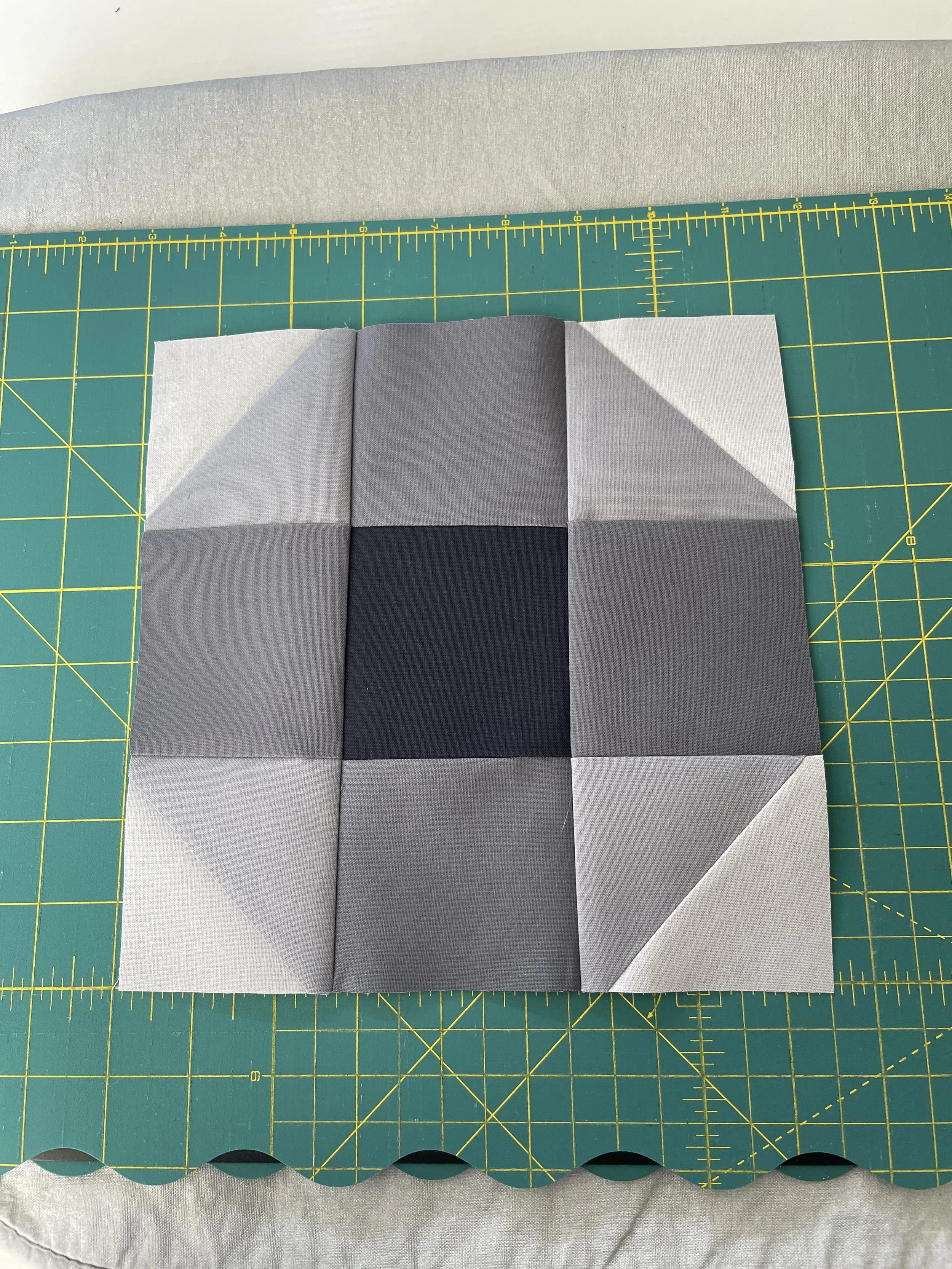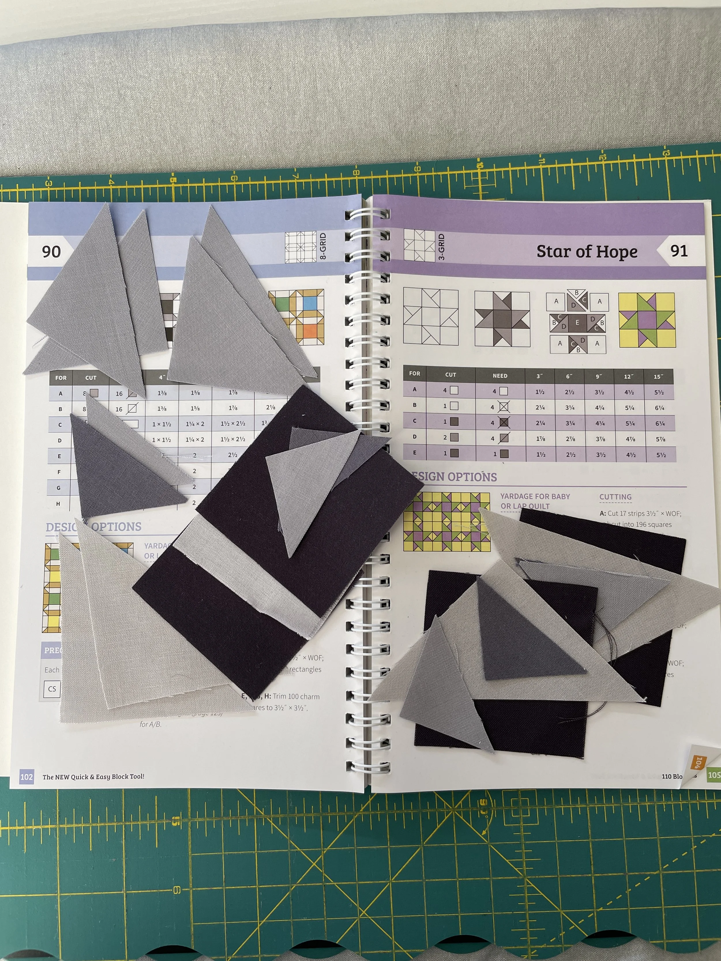 The block above is titled Star of Hope (again in shades of gray) and again our instructor suggested a 6” block. I used my Cricut (cutting machine) to cut the squares and then I cut some of the squares in half diagonally and again in half diagonally. At once I realized it was hopeless. Rest assured that the HSTs are TINY. I’m going to size the block up to 12” so the HSTs are easier to sew. This is a pretty block and while it’s not wonderful in gray, it will be attractive.