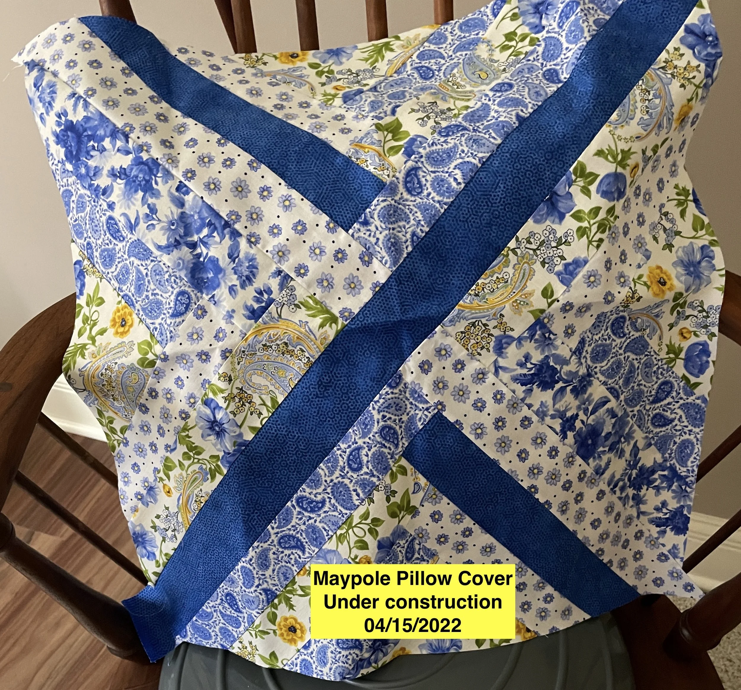 I fell in love with the Maypole pattern by Suzy Quilts and I discovered that she has a Maypole pattern for pillow covers. I bought it because I’ve been wanting to update my throw pillows. The unfinished cover above I’m calling “spring”. It is way beyond my comfort level with patterned fabric but it turns out to look really good in Mike’s office. I’m working on the second pillow cover and will have them finished in my next post.