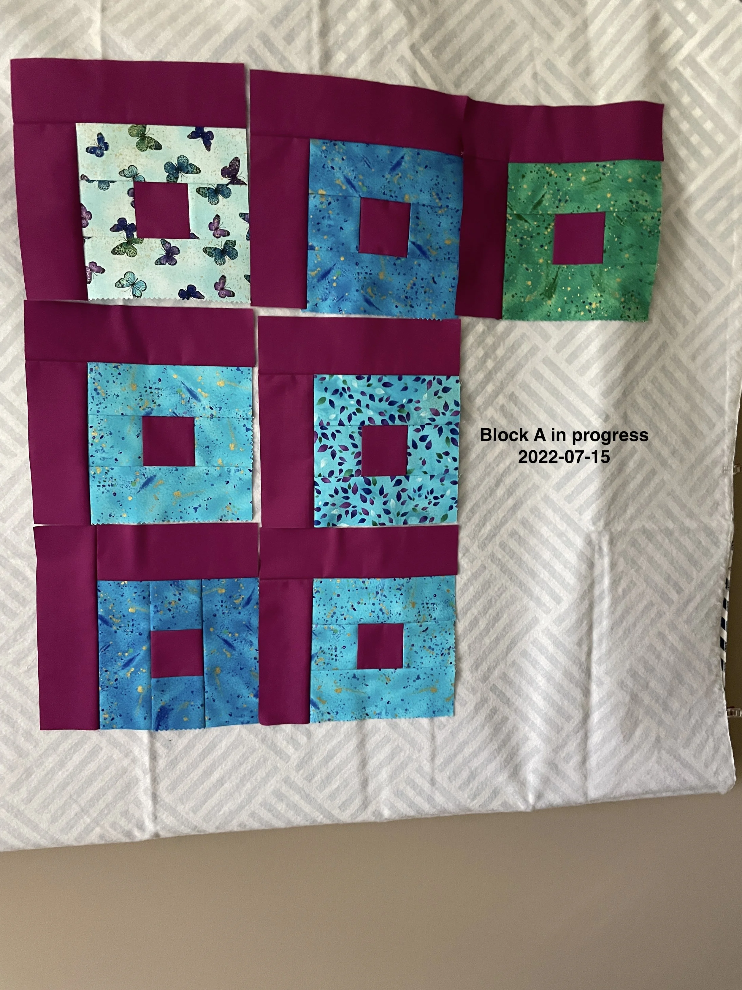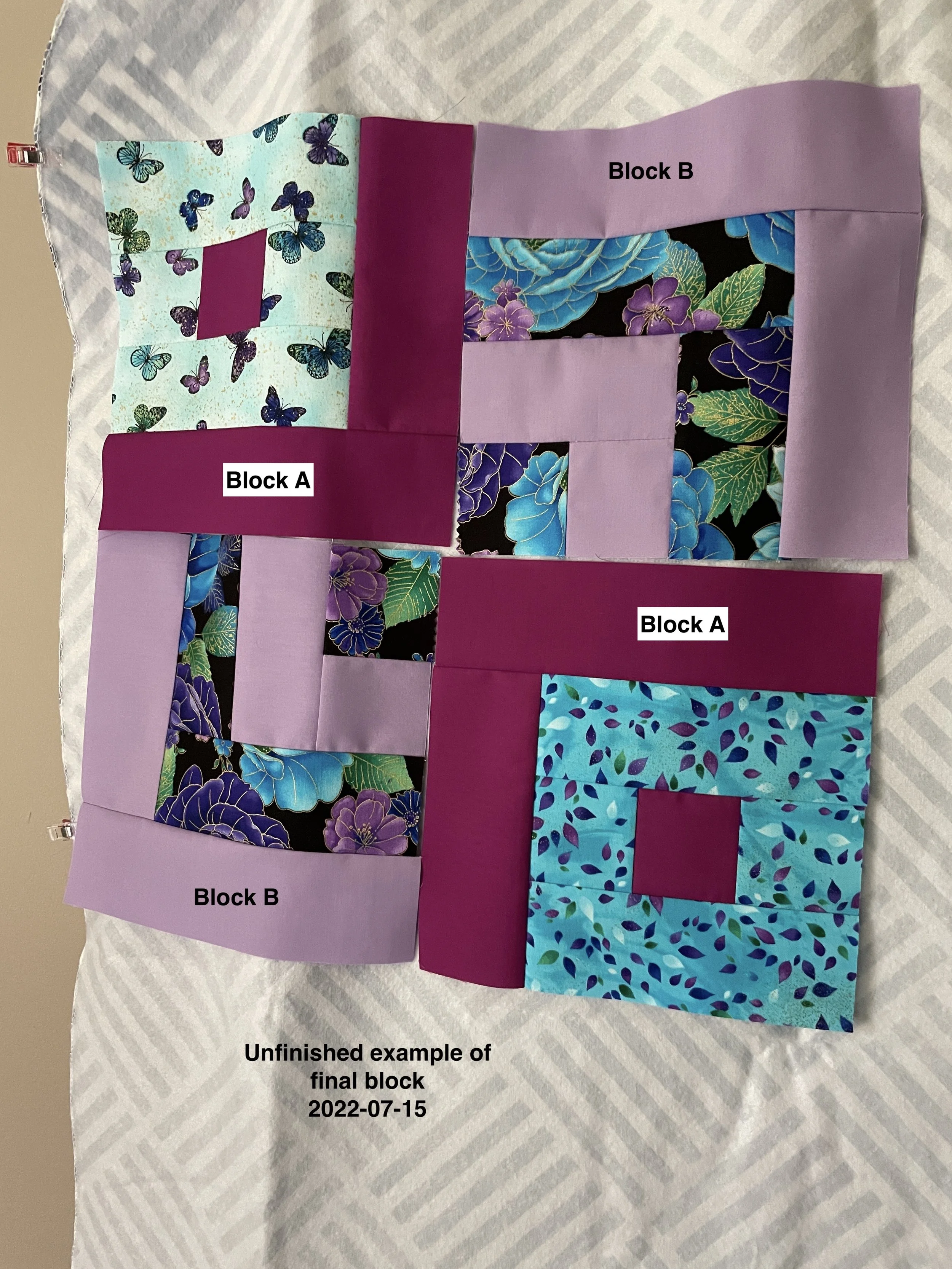 The quilt designer has two block - labeled “Block A” and “Block B” which fit together to form a larger block. You can see the larger block loosely fitted together on my new “design wall” (a picnic tablecloth with flannel on the back - it works wonderfully !) The Block Bs create the look of a broken squares - at least to my eye.
