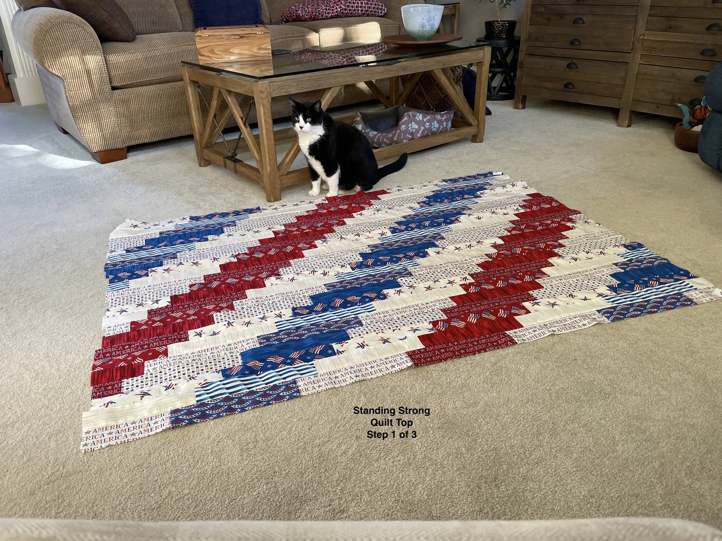 I’ve been working along on the Standing Strong quilt. I’ve finished part 1 of the quilt top: piecing together the quilt top (see picture below). Part 2 will be applying the first border (red stripe border in second picture) and Part 3 is the second border (blue in second picture). Then I’ll drop the quilt top, batting and backing to my longarm quilter who will quilt it and apply the binding.
