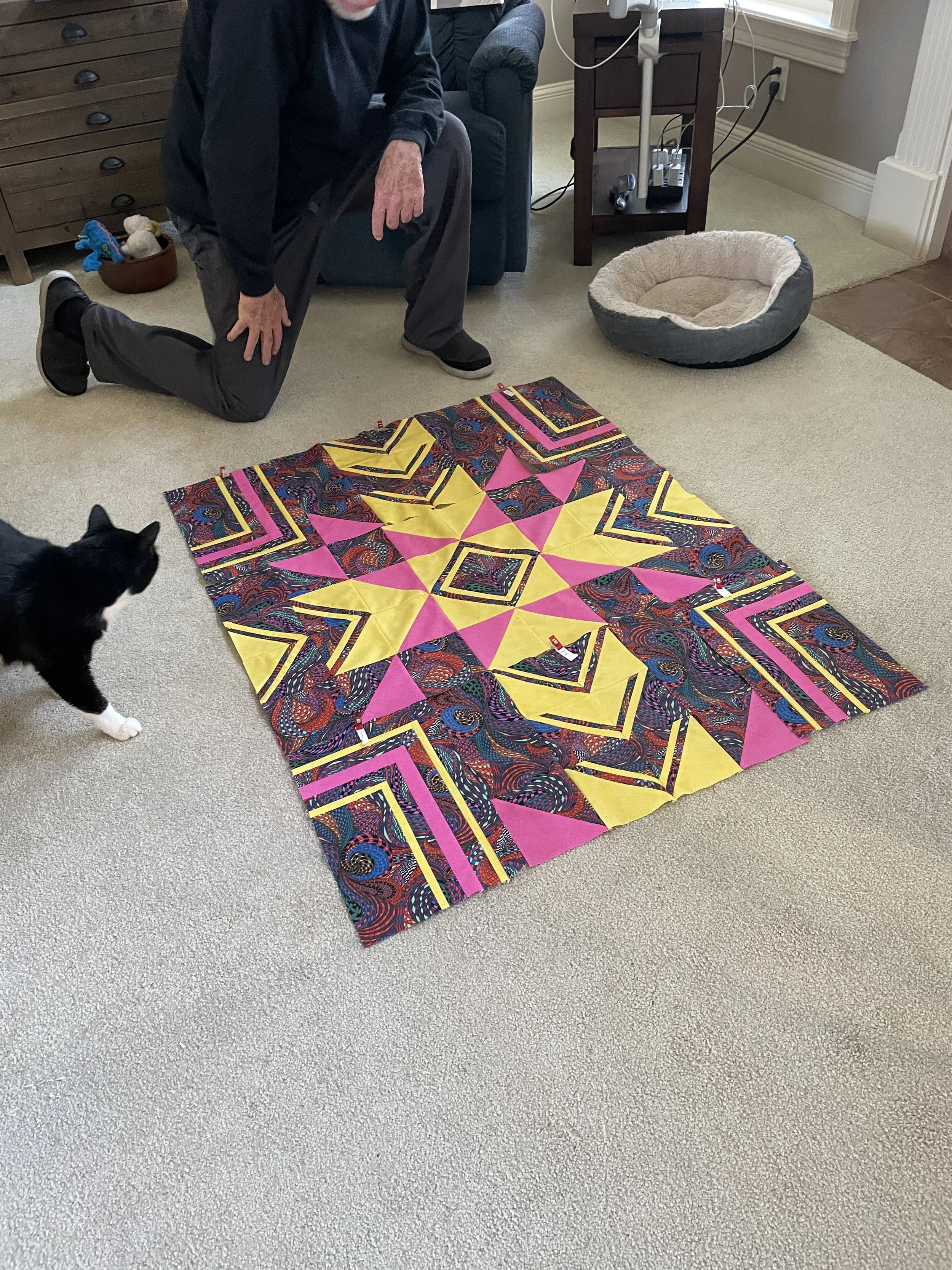 I’m making good progress on the Upland Star quilt. I laid out the sections on the floor and instantly acquired two helpers: one helpful the other, not so much 😁