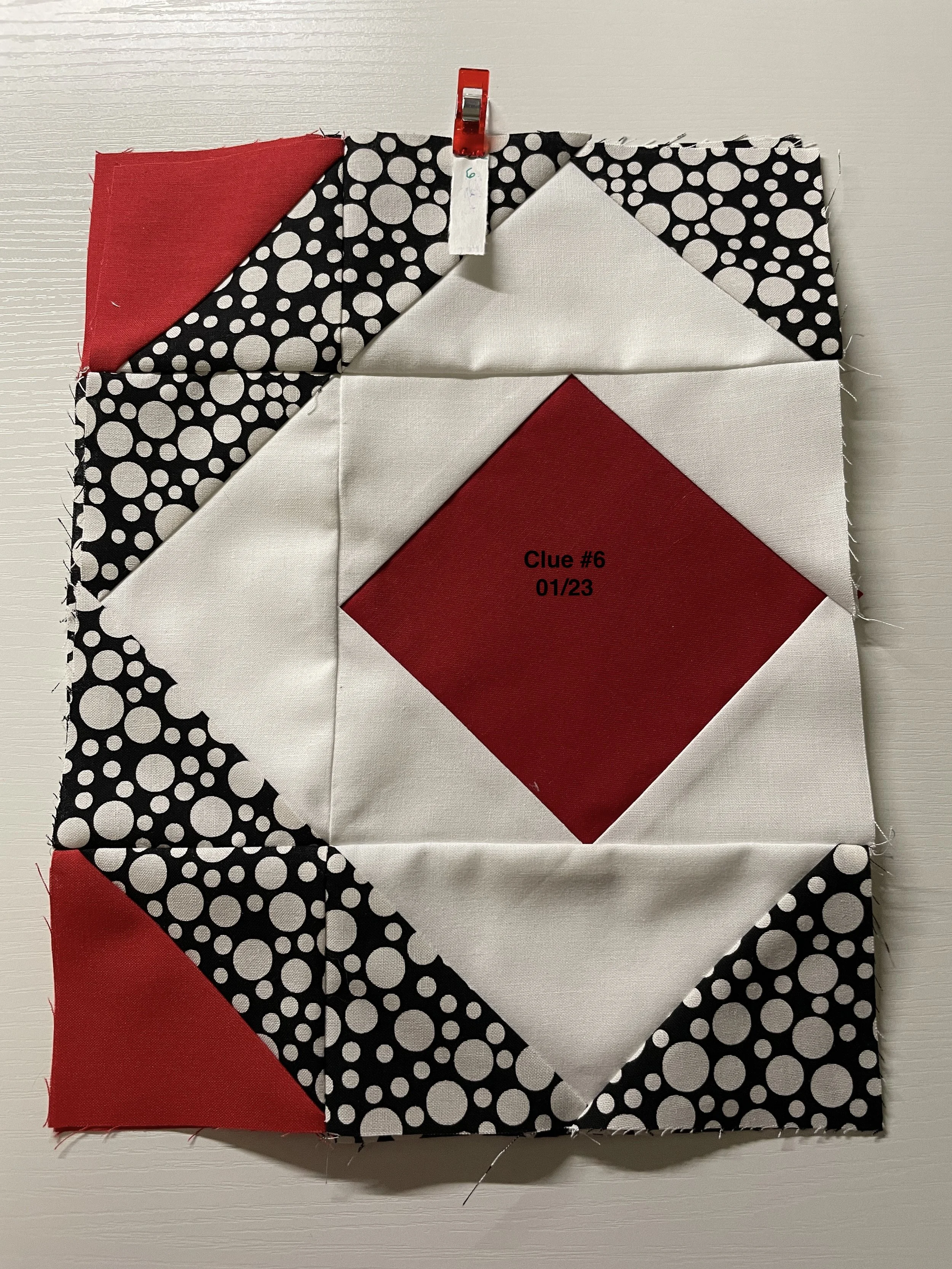 Clue #6 in the Mystery Quilt arrived in late December and I finished it in early January 2023. I’m loving the colors. I’ve set up a gallery on my home screen for the Mystery Quilt; you can view all the sections I’ve completed here.