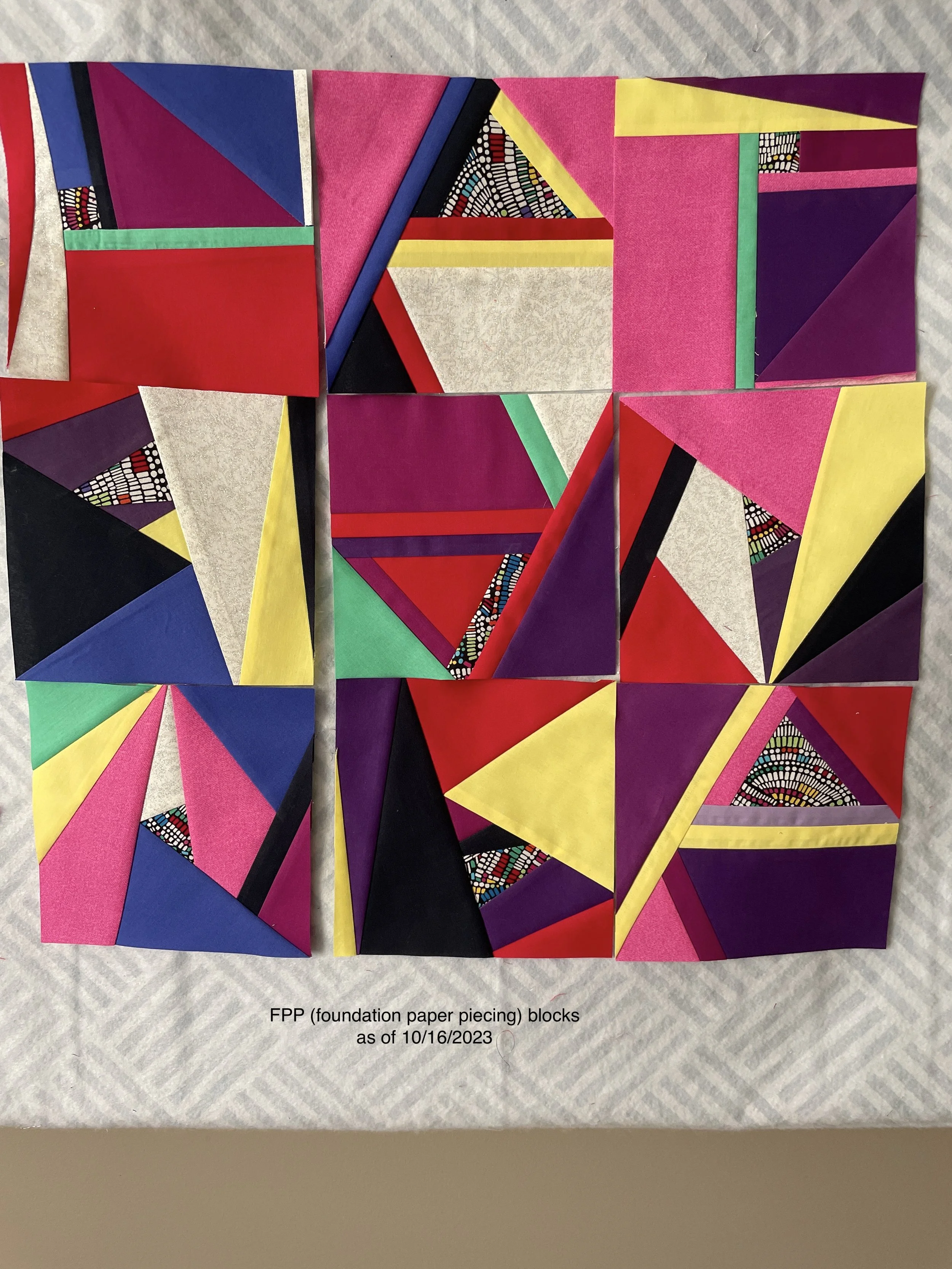The blocks for my “Happy Colors” (newly named by me) quilt are coming along. These blocks will not be jammed together like you see in the picture below. I’ll be sewing black borders around each block; I envision the quilt will be one FPP block, one block in a neutral color, then another FPP block. I think the neutral block will be a low volume neutral like a white-on-white print, but I’ll wait to decide that a little further down the line.