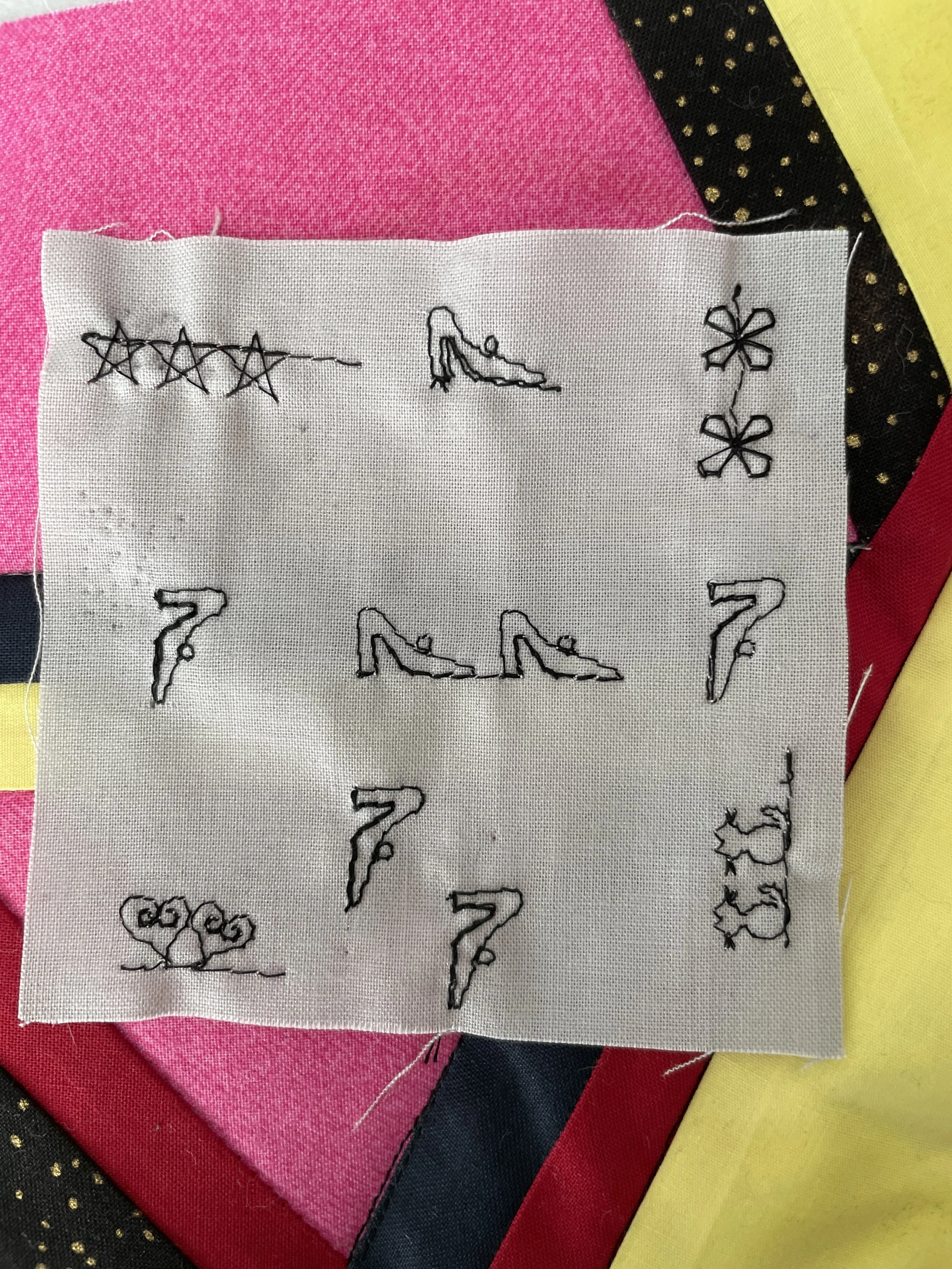 I had a fair amount of prep work before I could start the quilting process. I had the idea of a square spiral in the white blocks (see the post before this) and a scattering of specialty stitches in the colored blocks. Here’s an example of the specialty stitches I looked at.