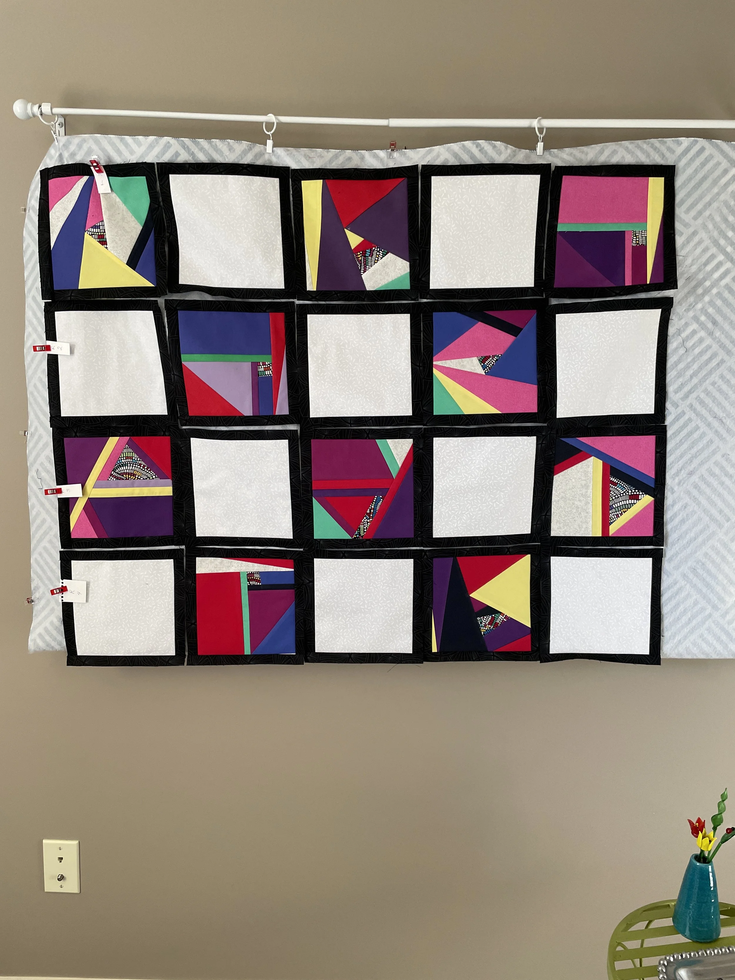 Here’s my design wall for the “Happy Colors” quilt; I have one more row that won’t fit on the wall.