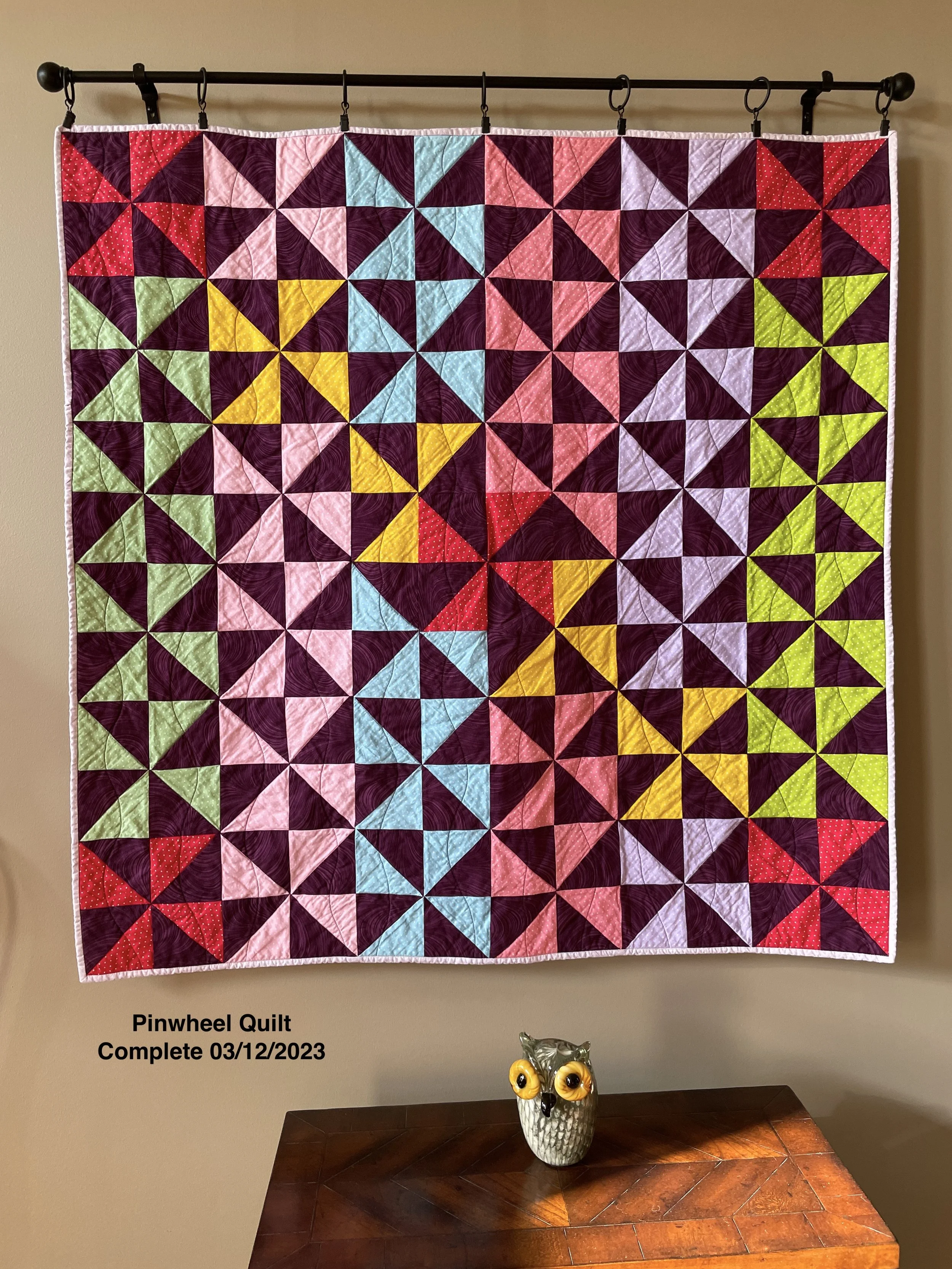 I’ve completed the pinwheel baby quilt and I’m very pleased with it. I decided to use wavy quilting, hoping this would make you think of a breeze turning the pinwheels.