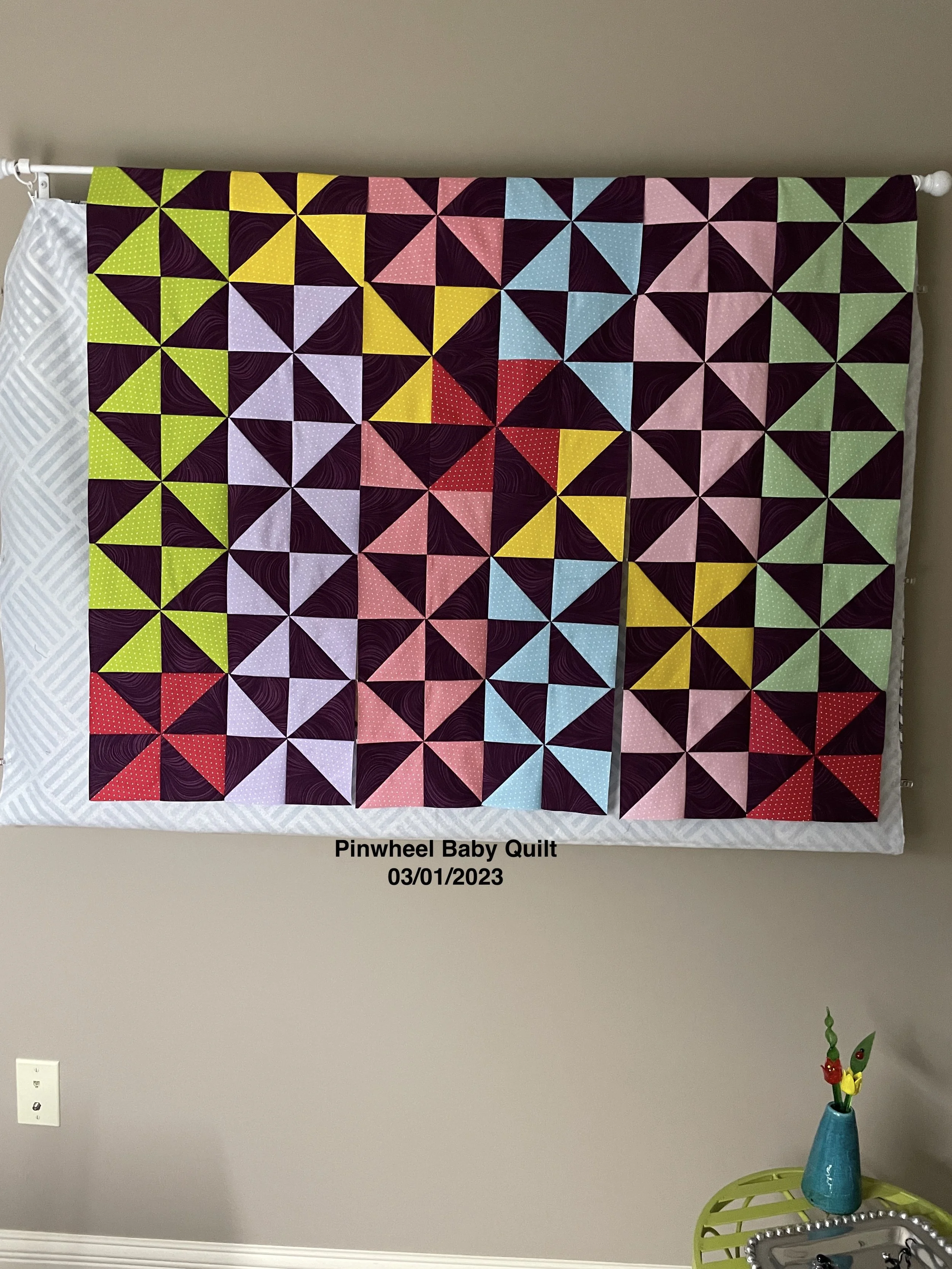 When I started the pinwheel quilt, I created a test block to learn the process. The first block (not surprisingly) was a no-go but the second was a winner. We liked it so much that I’m going to quilt it and we’ll use it on a side table. It’s 13” x 13” so a nice size.
