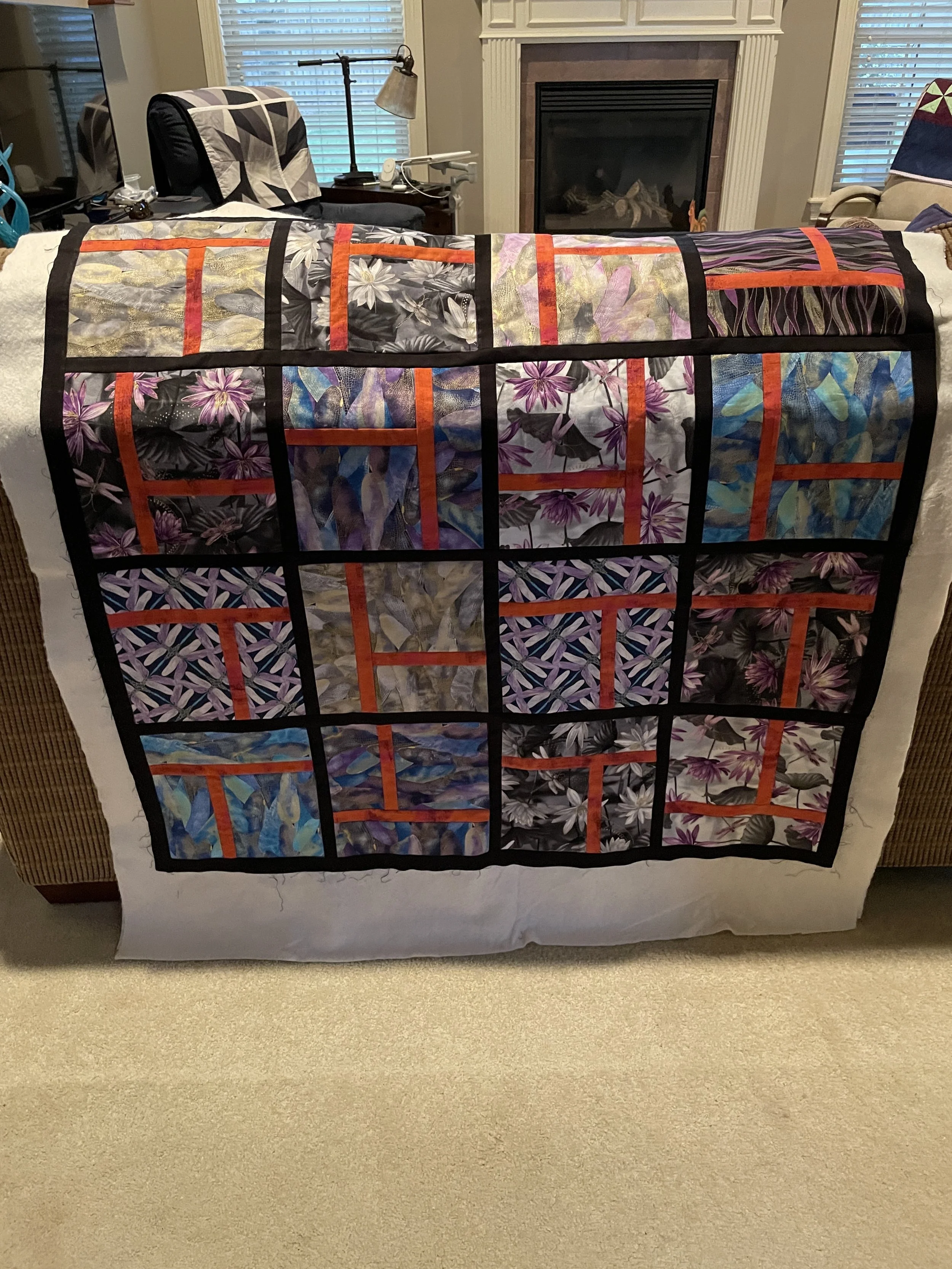 The Asian-inspired fabric quilt is coming along well; I’ve completed the quilting. I decided to use “stitch in the ditch” technique since there’s a lot going on with the fabric. You’re seeing the quilt sandwich that hasn’t been squared up yet; I’ll square it up, create and apply the binding and it’ll be complete. A finished quilt display in my next update.