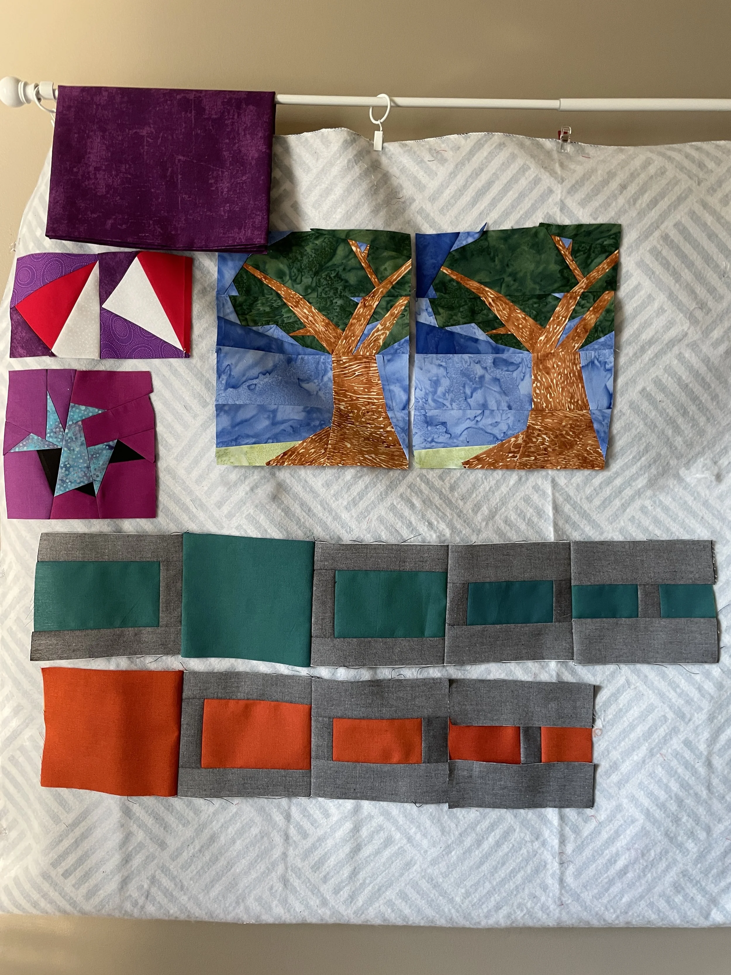 One of the very best video explanations (here if you want to see it) was “Waiting for Rain” — top row, two of the pattern. While I wasn’t all that enthralled by the pattern, she walked through each and every step of the process and that was invaluable. I think my current project will use a mitered border so the purple fabric draped over the railing will frame the tree and be the start of my learning mitered borders.