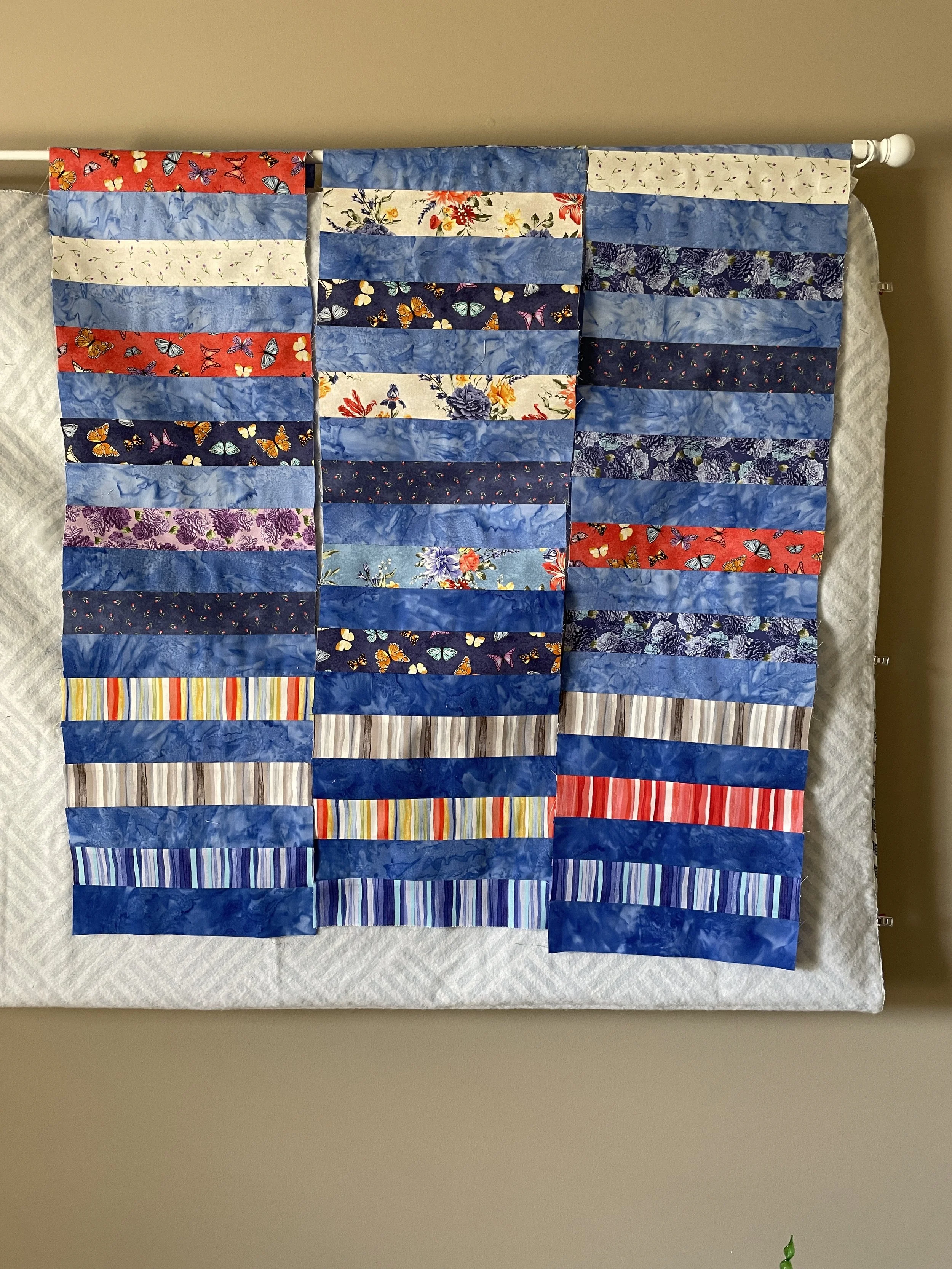 Doesn’t look like too much at this point, does it? 😉 I went looking for a fun fabric collection and I had gardens on my mind. I found “Delilah” — butterflies, flowers and stripes in lovely colors. This fabric is “Delilah” (hence the title) designed by Whistler Studios for Windham Fabric. I already had a jelly roll quilt in mind (jelly rolls are 2.5” wide by width of fabric [usually 240-42”] and I had some blue ombre fabric for the “sky”.