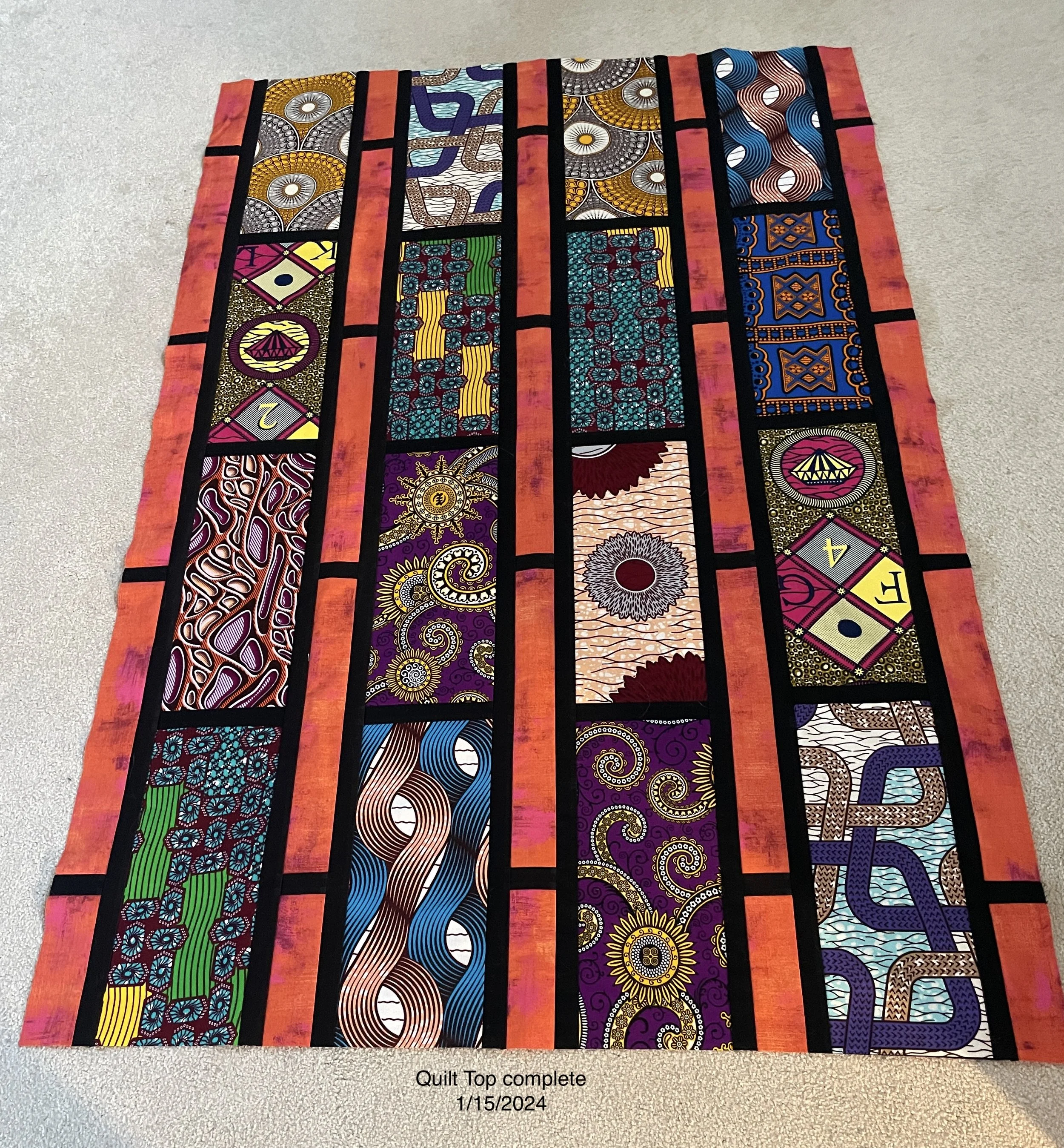 I completed the Dutch Wax Fabric quilt top on 1/15/2024 and I’m pretty pleased with the outcome (yes, I just realized it’s upside down. . . but hey 😬)