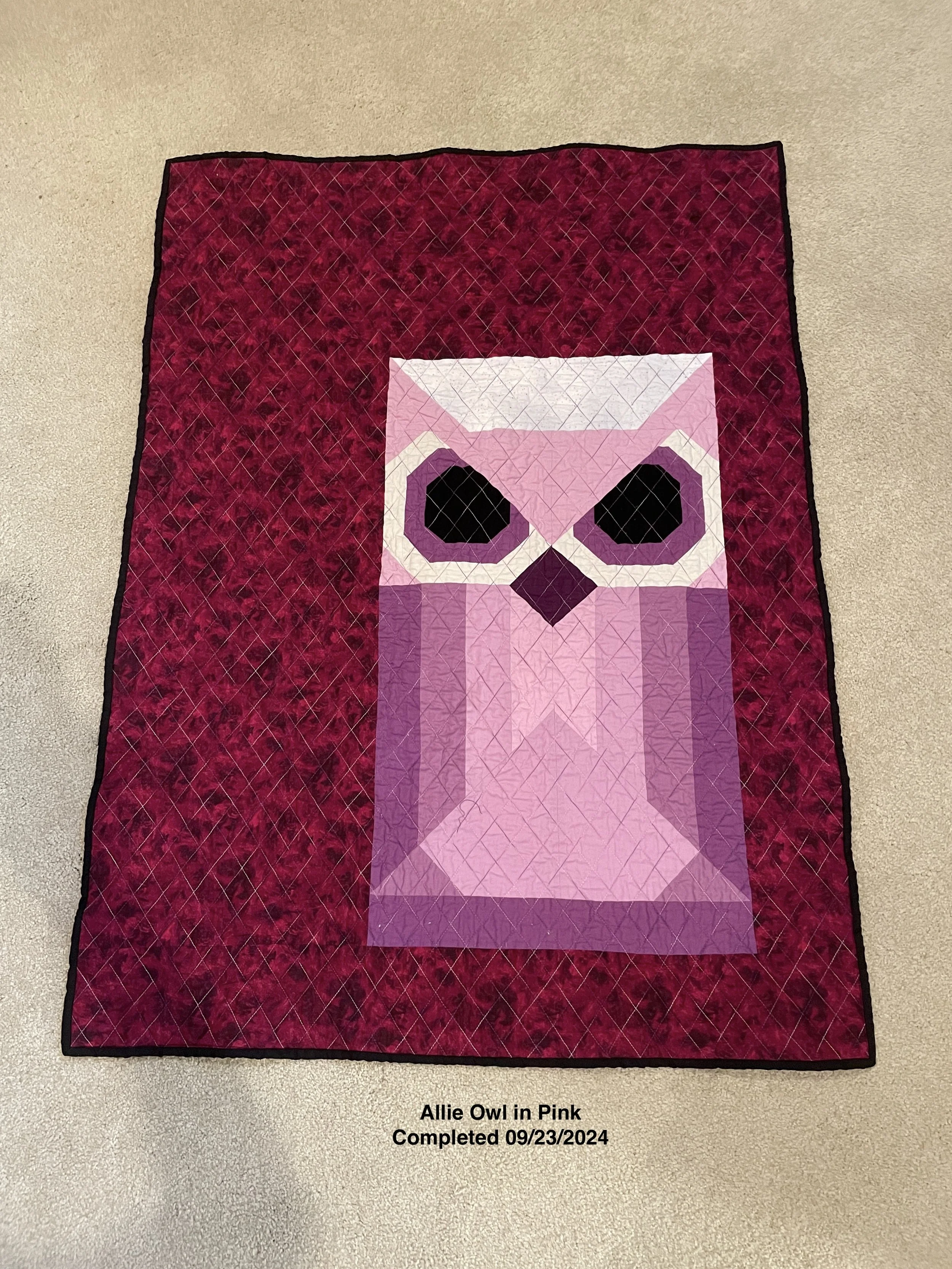 I’m very pleased (and my arms are very tired) with the quilting on Allie Owl. I quilted this on my domestic machine and it took three days to finish! This is closely quilted on the diagonal which creates the diamond pattern. I have to hold up the hanging edge of the quilt so the fabric runs smoothly under the needle. I have a whole new way of creating arm muscles 😁