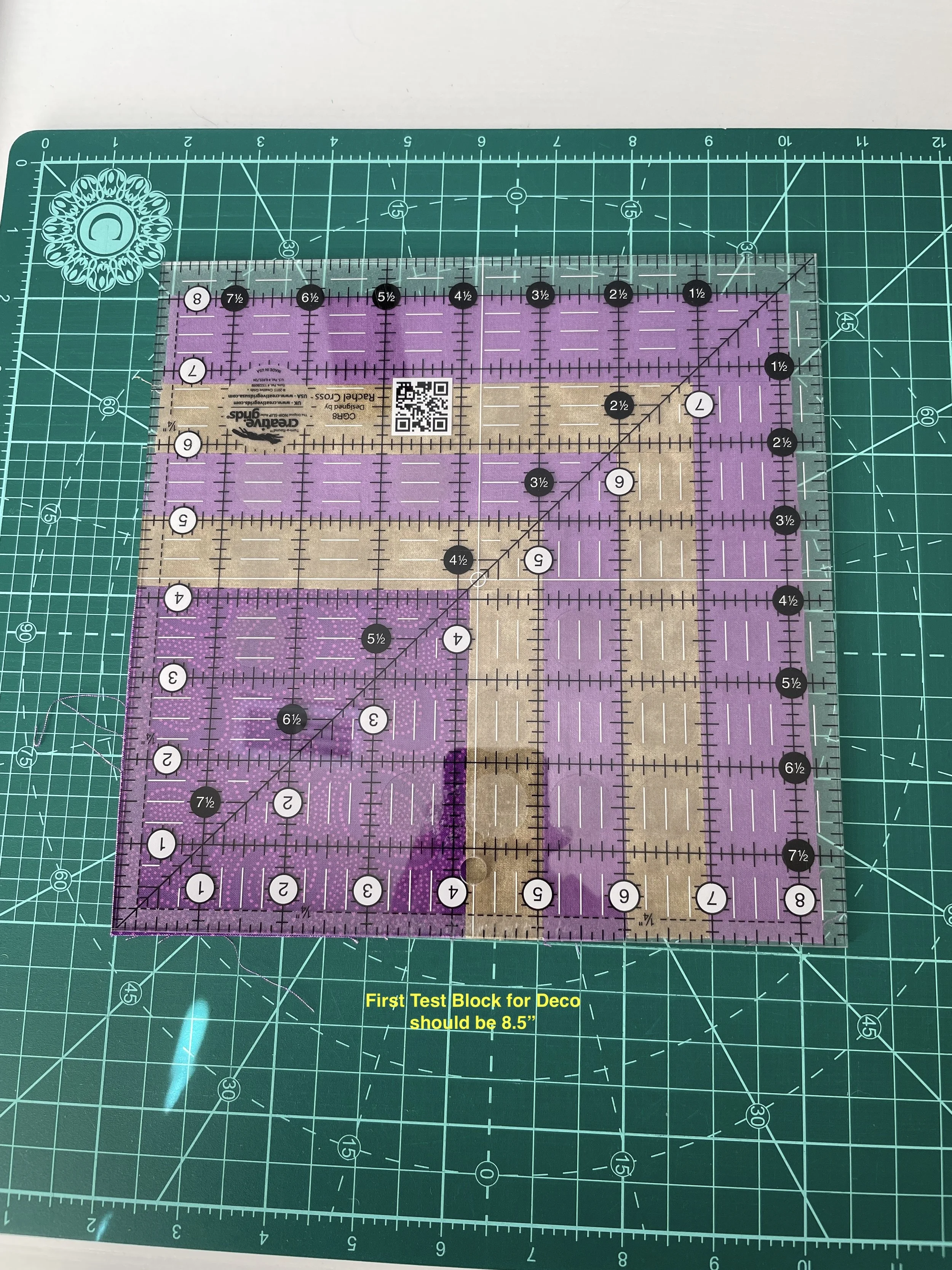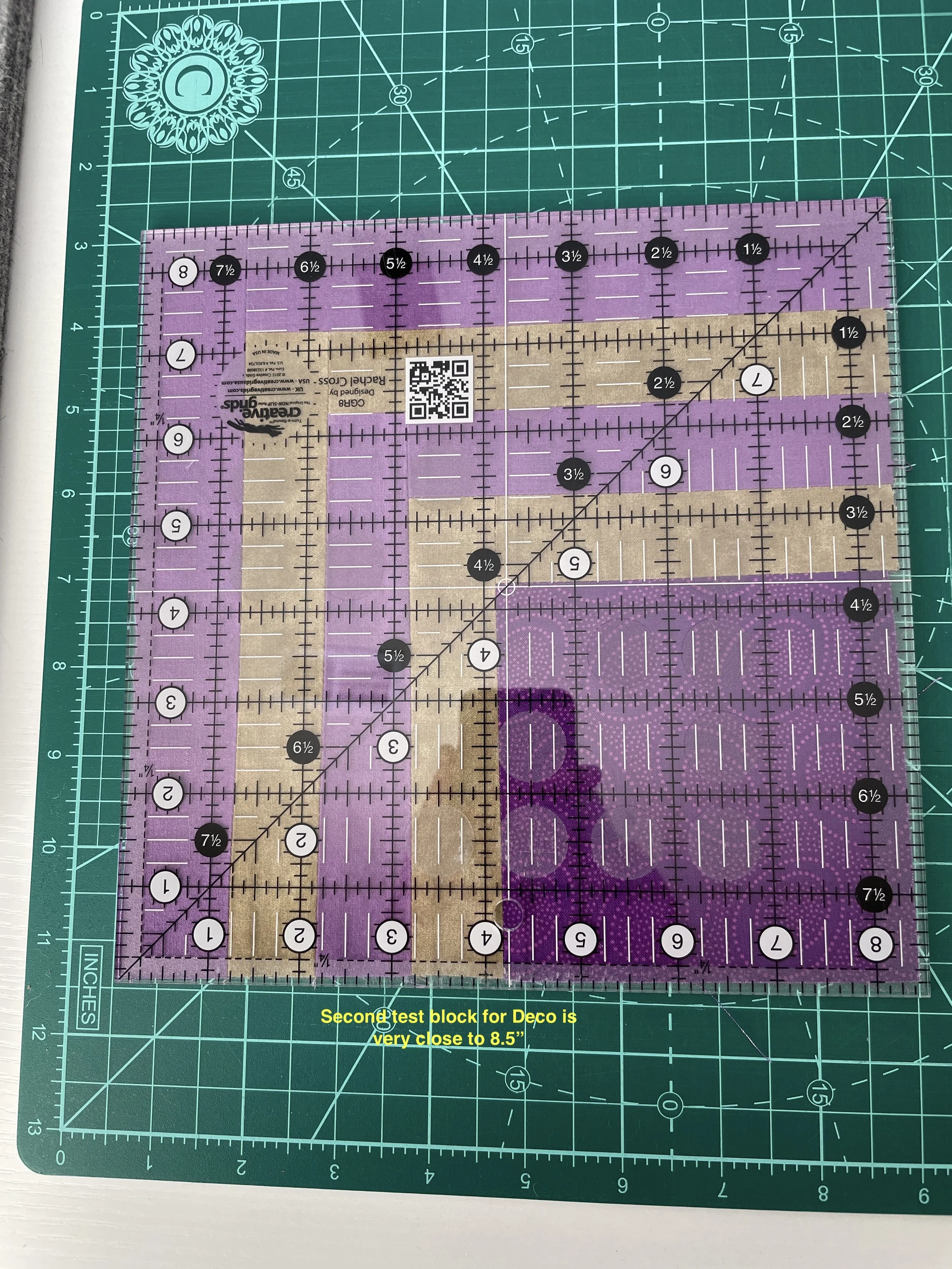 I’ve begun work on my next quilt Deco by Lo & Behold Stitchery. Practically since my first day learning to quilt I’ve heard about the “scant 1/4 inch” stitch which is kinda like a black rose or the treasure at the end of the rainbow — something greatly desired but (perhaps) unattainable. Brittany, the quilt designer at Lo & Behold, has written extensively about the scant 1/4” and how important it is — and now I know how desirable it is and how to attain it. Behold two test blocks which should be 8.5”