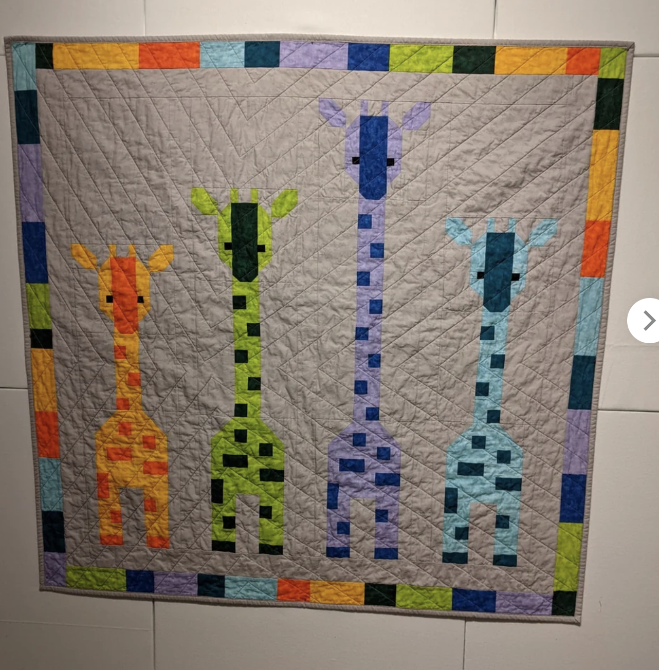 I’ve pretty much decided that “Giraffes in a Row” by Lorna McMahon of Sew Fresh Quilts will be my next project. I’m thinking of a dark chocolate background with the giraffes in lighter shades of brown. I’m making the baby quilt (39” x 39”) but, as the quilter has done on this inspiration quilt, I might add a border to two to make the quilt larger. This quilt will be a real winner, I think. . .