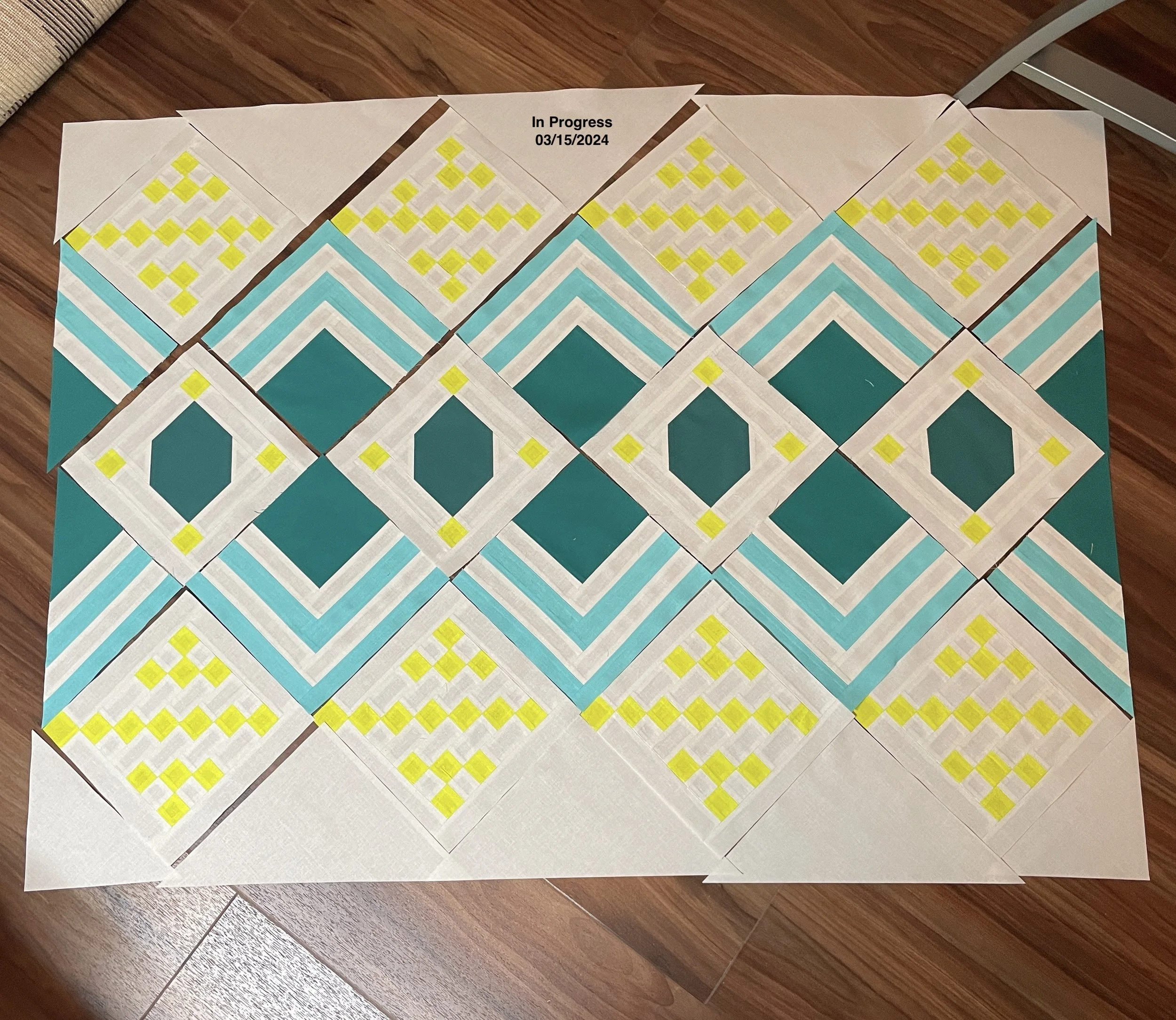 The Deco quilt (pattern by Brittany Lloyd of Lo & Behold Stitchery) is coming along, although haltingly. I’m moving slowly as I learn new techniques and methods. This will be ready to go to the longarm quilter in the next couple of days though (3/19 or 3/20). Her usual turnaround is about two weeks, so you’ll see the finished quilt around early April.