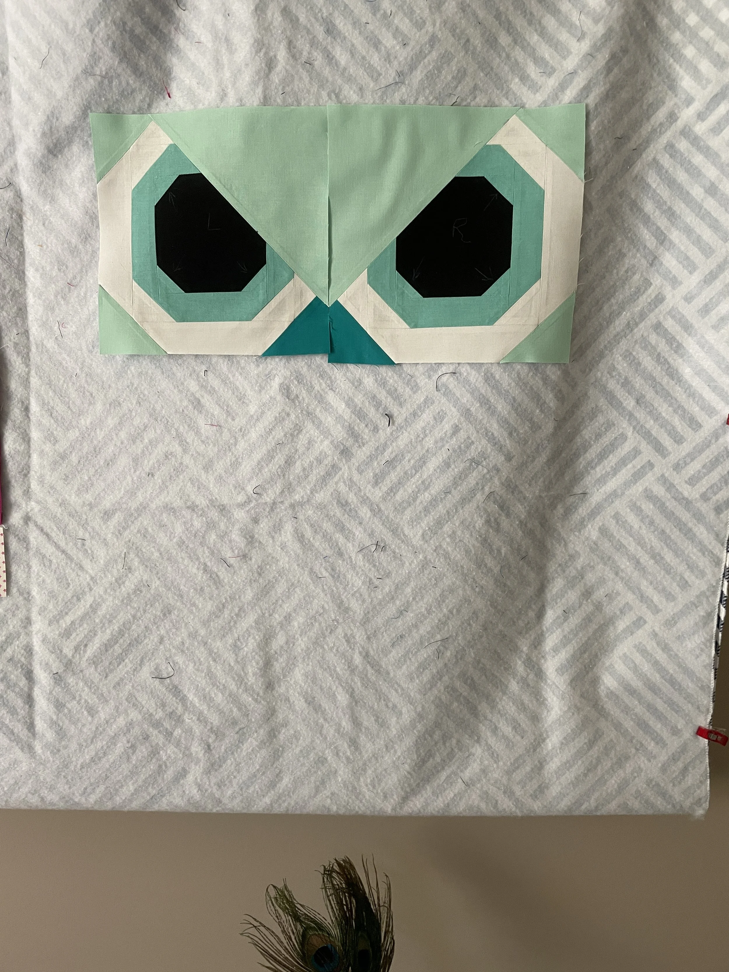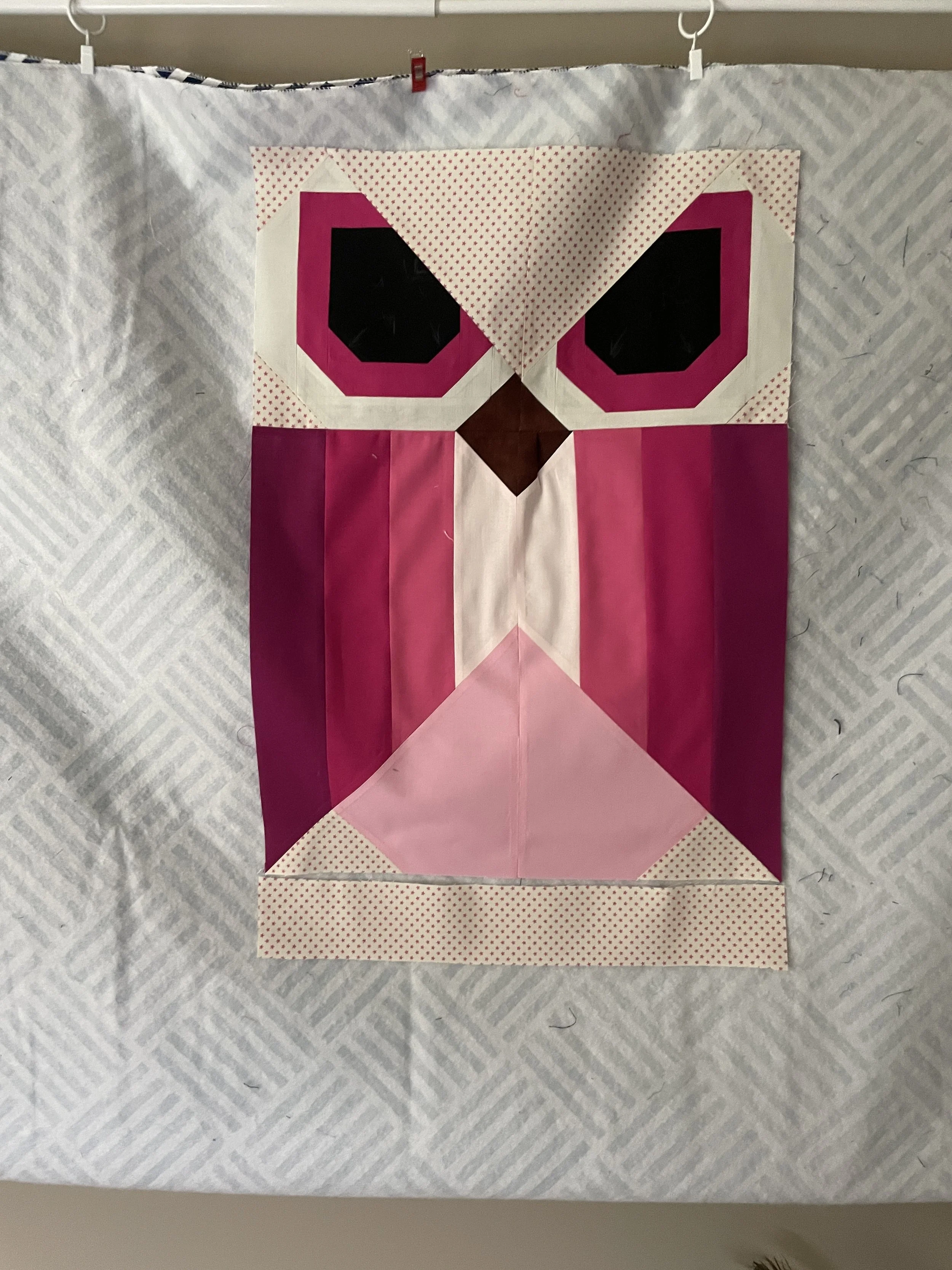 I’ve begun working on a sample Allie Owl. The beak gave me problems on the pink and now the green. Neither of us liked the pink — too much pink and too many dots. The green will use solids only. I’m not exactly sure what is going on — improper cutting? 1/4” seam(s) too big or small??