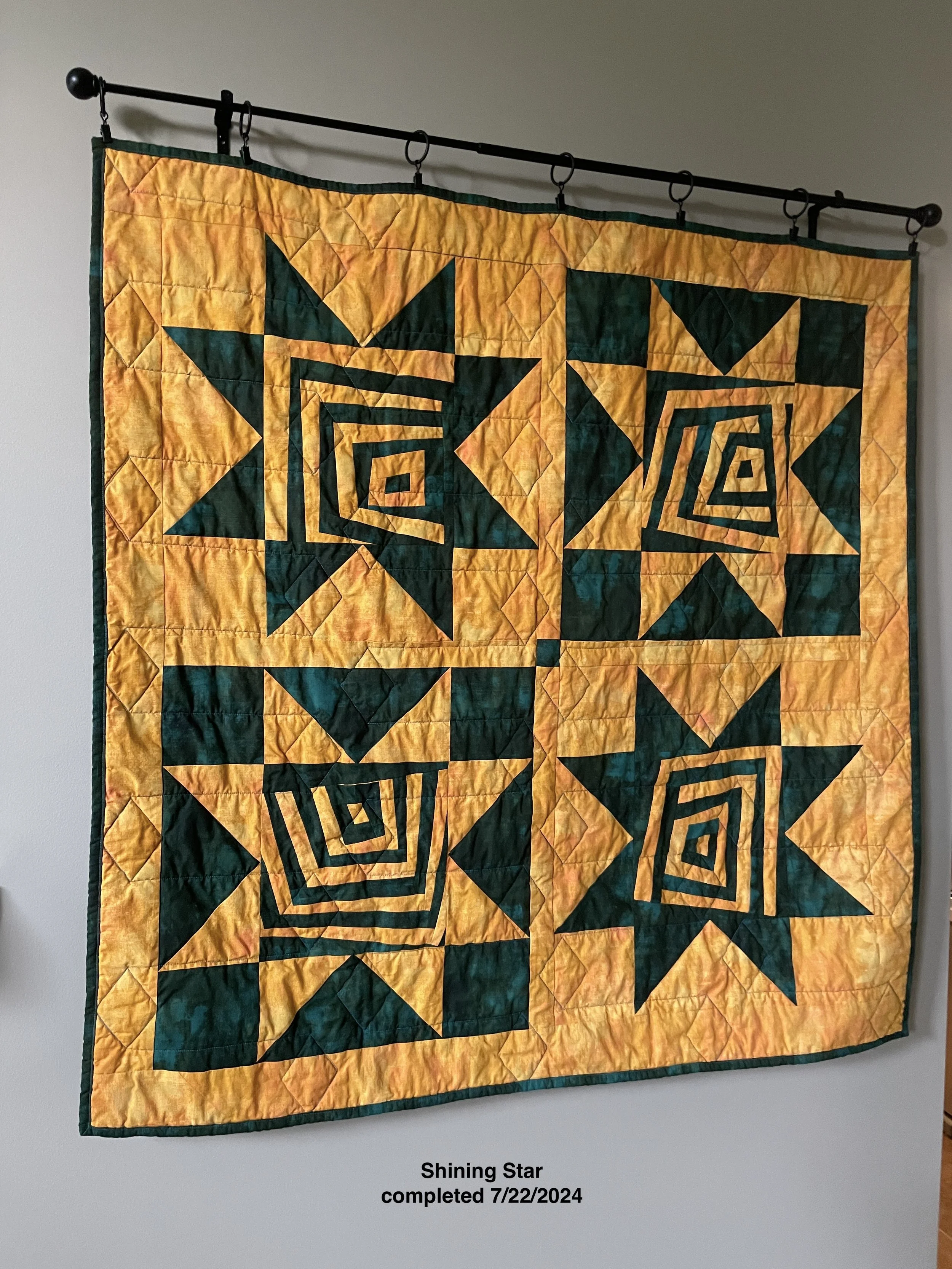 The Shining Star quilt is complete and back from the long armer ! Here’s the front of the quilt and (a not very good) picture of the back. Zoom in closer to see pattern.