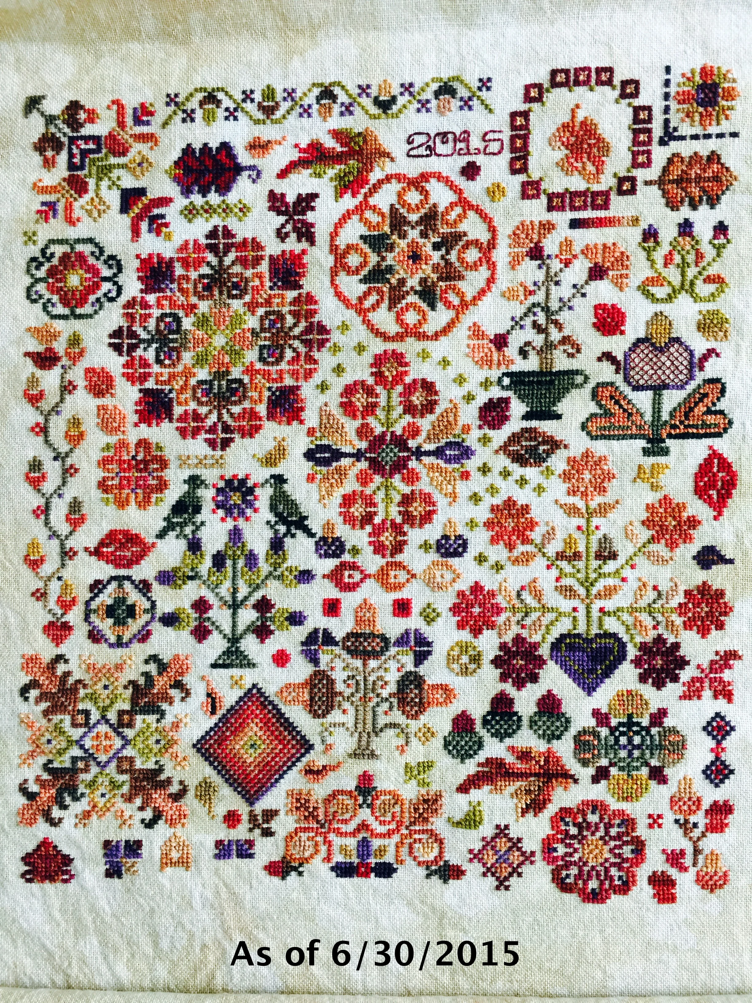 This sampler is moving along well; I'm about three quarters of the way through with it. I'm really liking the images and the feel of the fabric and the floss continues to delight me.